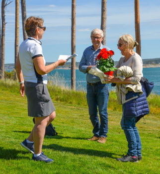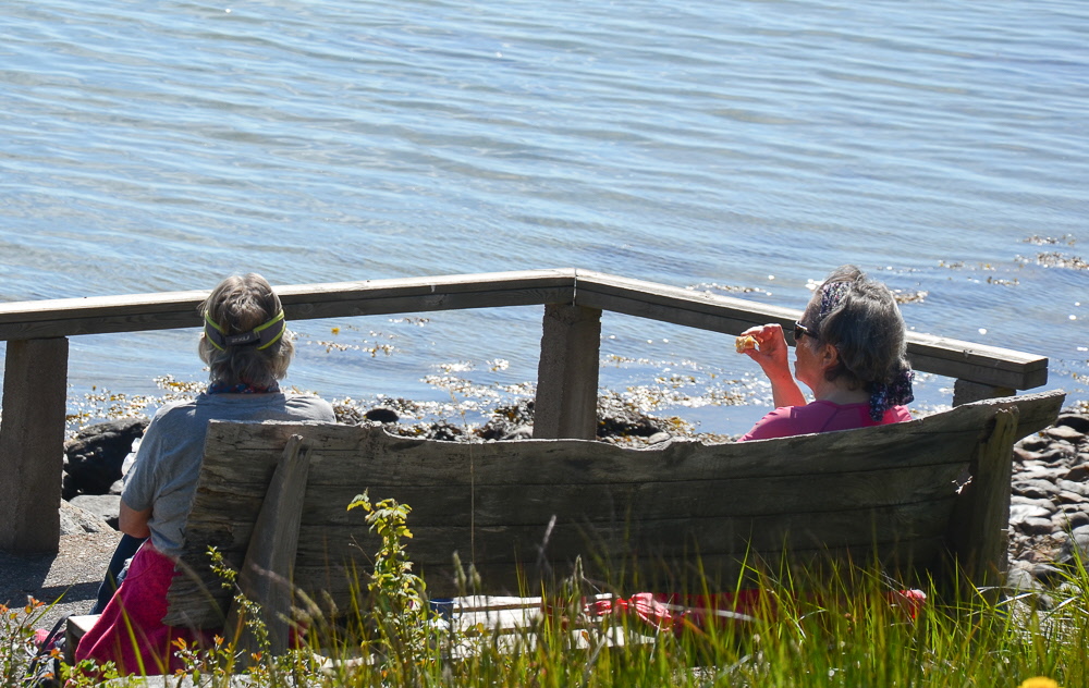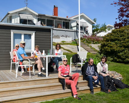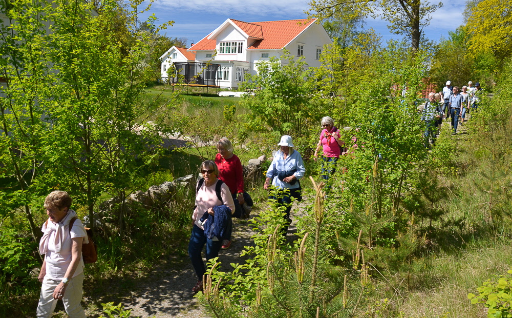 Vi var många promenadsugna, som letade oss till Berga hamn på Hakenäset på Kristi Himmelsfärdsdagens förmiddag. Bergapromenaden i det fantastiska vårvädret följde vägen mellan gårdarna upp till Porsdalen. Tröja och jacka fick successivt plockas av i uppförsbackarna. Vid Porsdalen hade vi en härlig utsikt över Hakefjorden. Nerförsbackarna till Sandviken gick mellan blommande träd och buskar. På Margaretas och Lennarts tomt hittade vi många sittplatser på behöriga Corona-avstånd. Vi fikade och åt glass och överlämnade en sommardahlia till promenadledarna. Ingen badade den här gången heller. Margareta avslutade med en dikt som skrivits av den på Hakenäset uppväxte Ernst Manker. Sista biten tillbaka till Berga hamn gick vi på klipporna utefter vattnet.