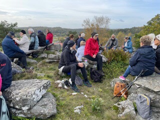 Till Fjälebrovallens parkering kom 34 vandringsglada Tjörnveteraner. Bror Berndtsson guidade oss runt i Fjälebro och berättade om bygdens historia. Vi gick på gamla brukningsvägar ner mot Sundsbykile och Sundsbyholmarna. Sedan gick vi upp till ett berg där det tidigare funnits en väderkvarn. Där vi fikade medan vi såg på den vackra utsikten. På väg tillbaka till bilarna tittade vi in i den nyinvigda Fjälebrokvarnen.