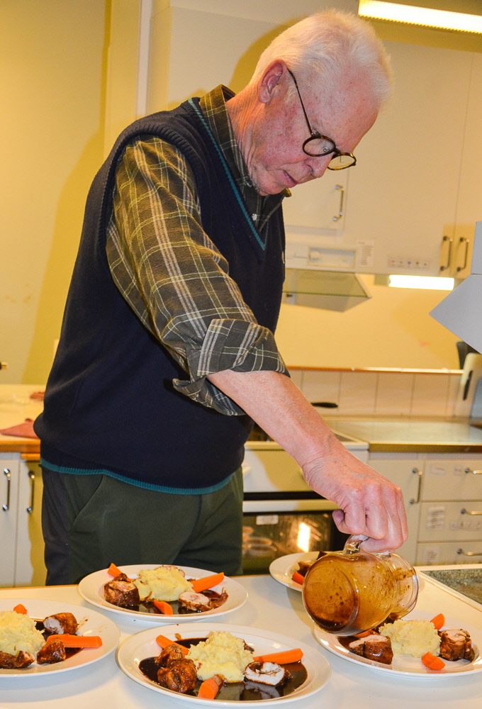 Under fem tisdagseftermiddagar har tio matglada Tjörnveteraner träffats i Häggvallskolans hemkunskapslokal och lagat trerätters middagar och ätit gemensamt. Detta var tionde omgångens matlagning under ledning av Dagrun Trewe och Lennart Andersson.
