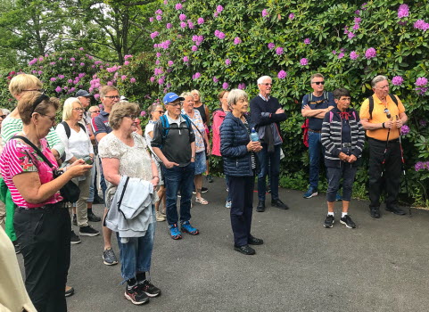 38 Tjörnveteraner träffades på Fjällebrovallens parkering och promenerade till Runes Rhododendronpark. Rune Thedin hälsade oss välkomna och berättade om sin blommande park. En vacker och informativ vandring bland rhododendron från världens alla hörn och blommor som vi förknippar med svensk försommar. Margareta gratulerade Rune till den vackra parken och tackade Eva och Henry för deras engagemang med vårens promenader.