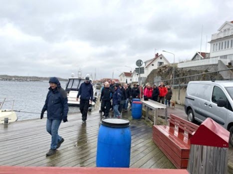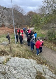 Sparbanken för hjälp! Klockan tio startade 31 st Tjörnveteraner plus personal från Sparbanken vandringen i Skärhamn. Mona och Björn Malm visade oss runt. Vi gick längs vägar och även på en liten skogsstig. Såg både den nya och gamla bebyggelsen. Vädret ja, några droppar regn och lite vind men inget som stoppar oss!