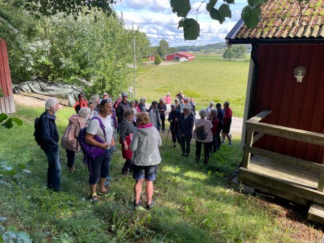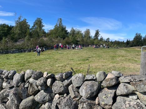 Därefter fortsatte vi promenaden upp mot Apleröd och Styrdalen. Vid dösen stannade vi och tog del av dess historia. Efteråt gick vi tillbaka till Aspeberget. Där fikade vi och tittade på de fina gärdesgårdarna och i hagen bredvid kikade några nyfikna kor på oss. Vi fortsatte mot Hjälteby och Kråkdalen. Vi pratade om det gamla kommunhuset och byggnaderna där omkring. Sedan var vi strax framme vid bilarna igen.