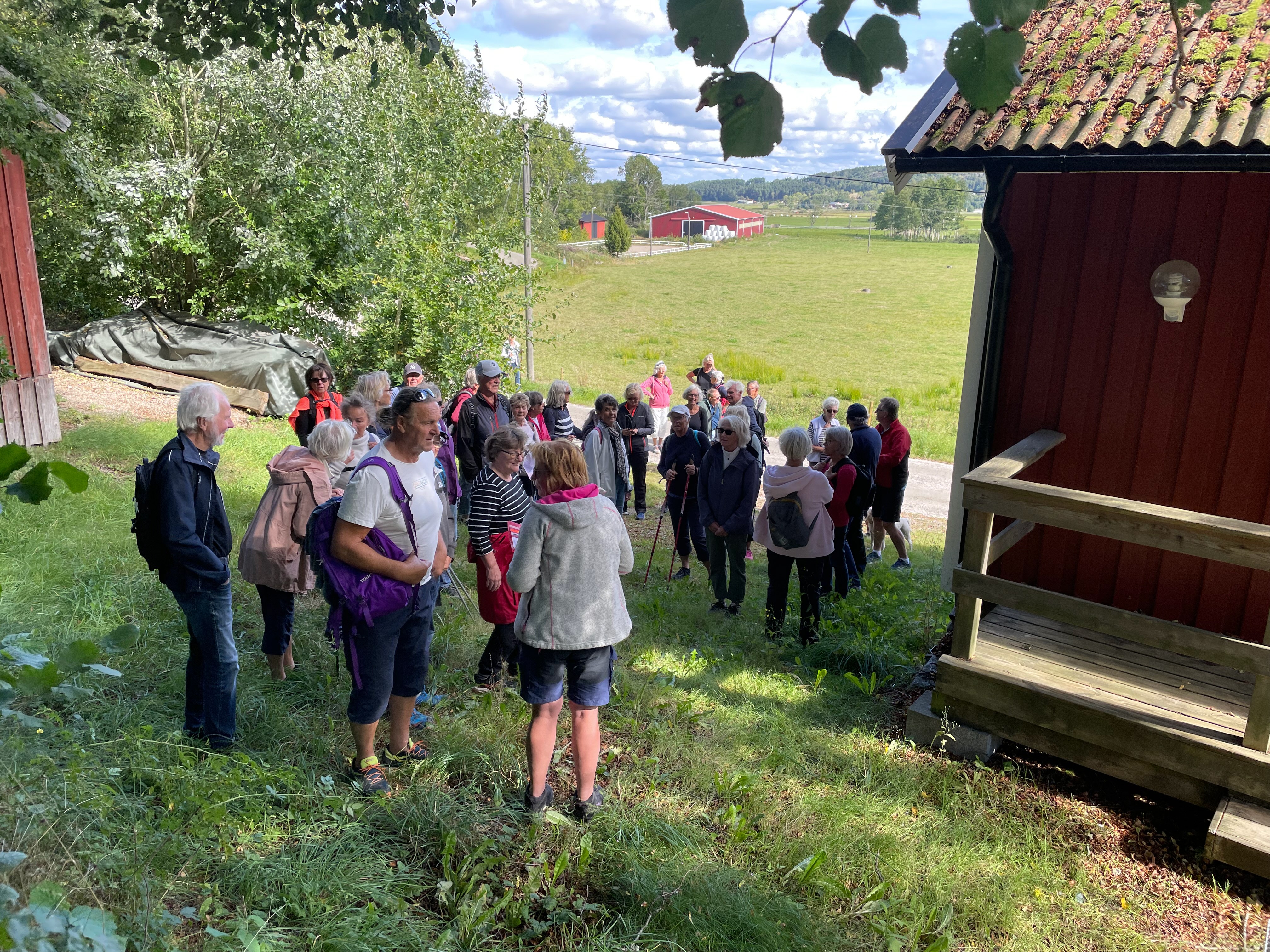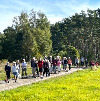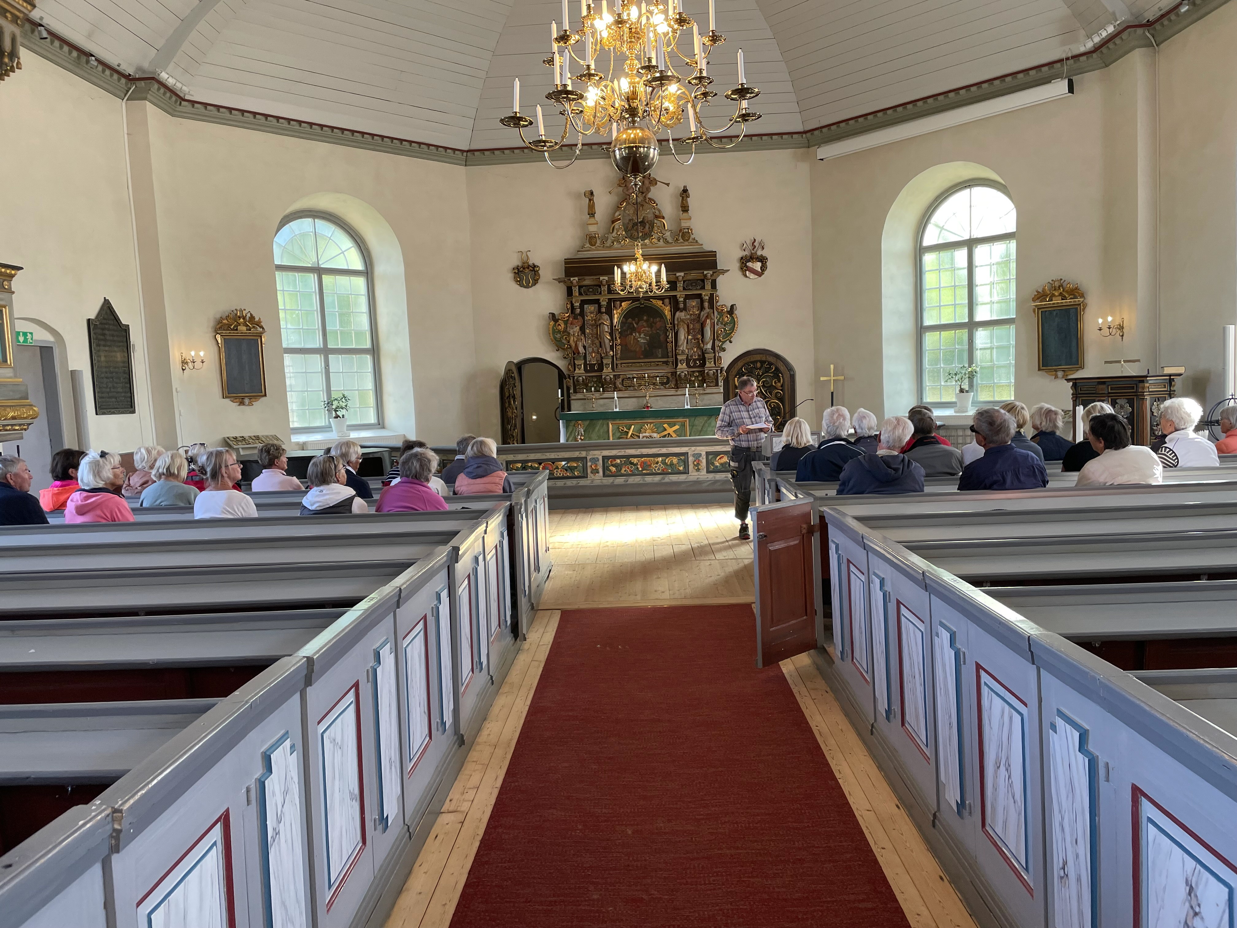 Veckans vandring startade på Valla kyrkas nya parkering. 41 stycken tjörnveteraner gick upp till kyrkan och möttes där av vaktmästare Thomas. Han berättade informativt om kyrkans historia och om Margareta Huitfeldt.Vi fick också besöka Valla kyrkas gravkor.