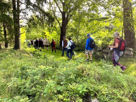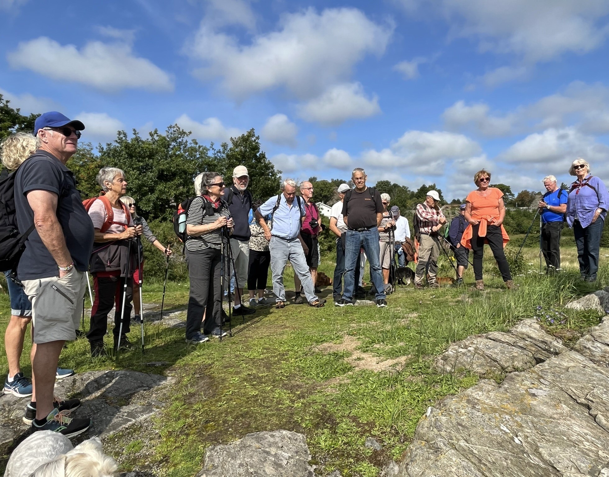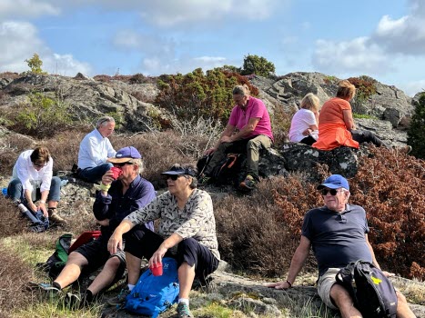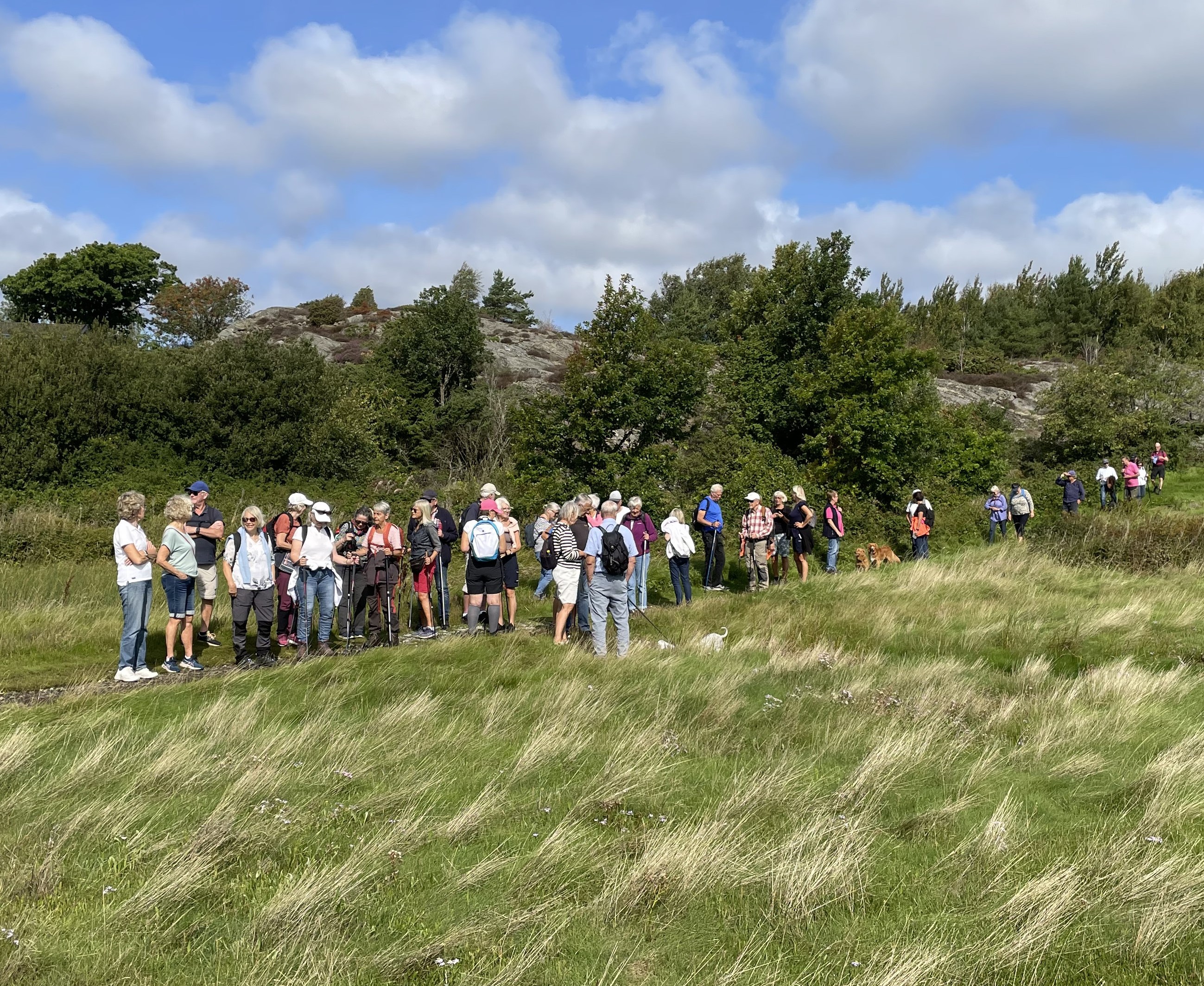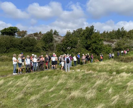 Solen sken på oss 38 Tjörnveteraner när vi startade vår vandring från Mölnebo odlingar. Vi gick över fältet upp mot grillplatsen i Håltet. Vi följde gamla vägar ner till landsvägen. Sedan vek vi av från landsvägen ner mot Änghagen. Där stannade vi till och fikade och tittade på utsikten ut mot havet. Idag hade fick vi lite information om de olika platserna vid havet av Ingrid Pettersson. Vi följde upptrampade stigar upp och ner tills vi kom fram till Mölnebo odlingar igen. Några av oss passade på att handla lite nyodlade grönsaker av Malin. Idag blev sträckan ca 6 km.