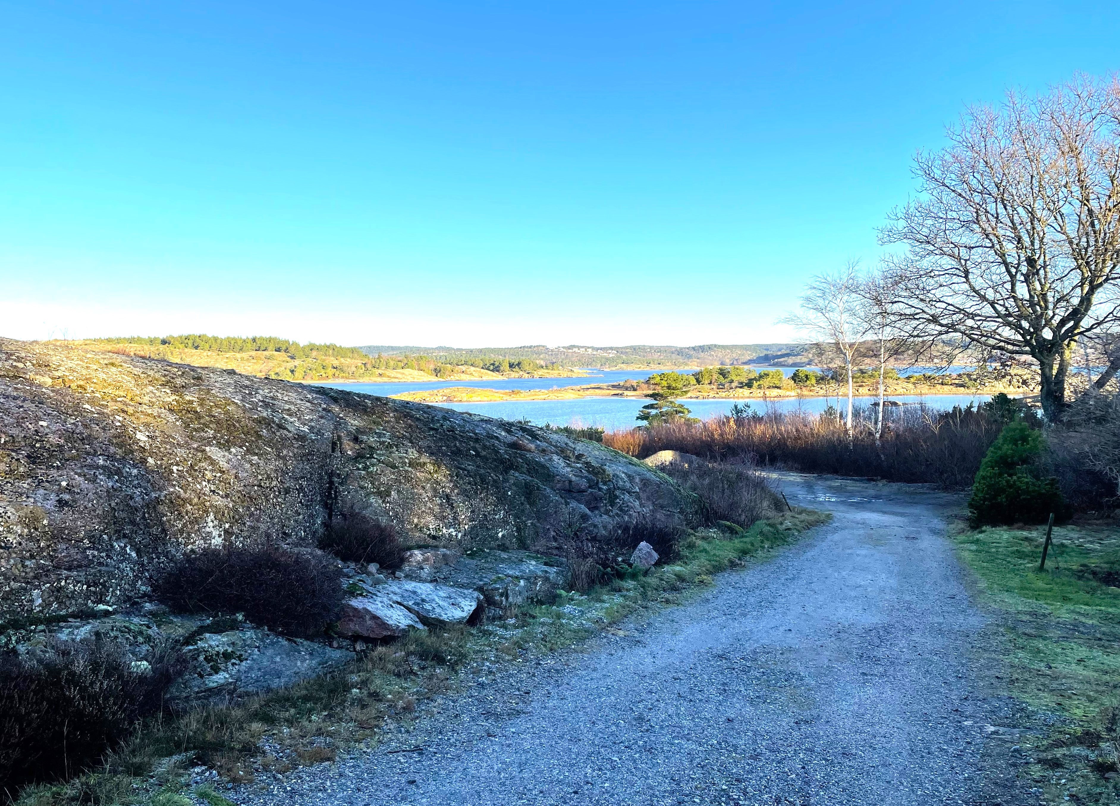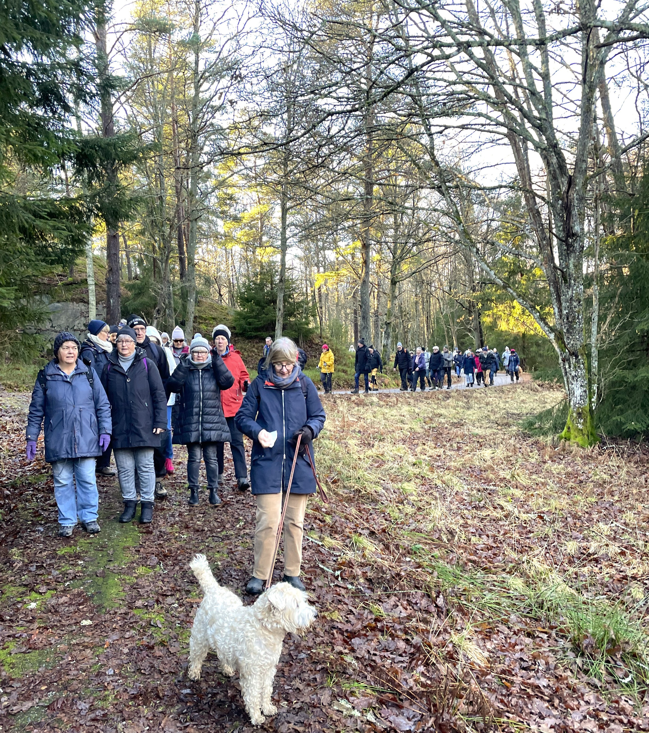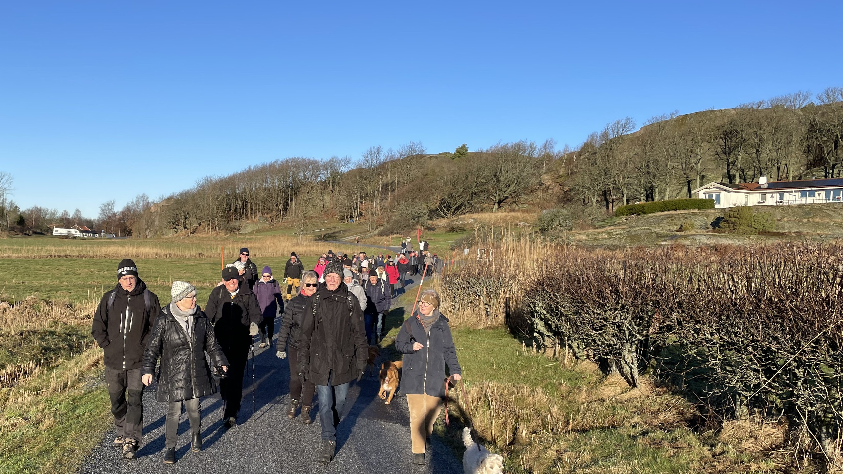 Vilken dag vi fick!! Började med glashala vägar och strålande sol. Ändå var vi 52 stycken Tjörnveteraner som startade vid Skåpesund.Vi tog oss ner mot Näs och såg den vackra utsikten mot Orust. Fortsatte vidare till Röd och strax innan Källdalen stannade vi för fika i skogsbrynet och njöt av både sol och fika. Sedan vandrade vi vidare på den gamla landsvägen upp mot och genom kotunneln. Innan kotunneln låg ett stort hinder (ett nerblåst träd) så där fick vi krypa eller hoppa över. Vi följde sedan skogsstigen tills vi kom till den gamla vägen som gick till Skåpesund.