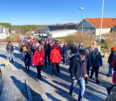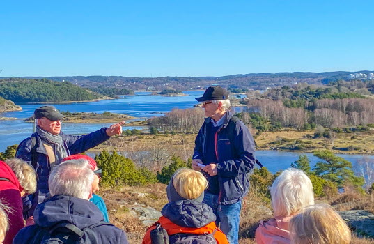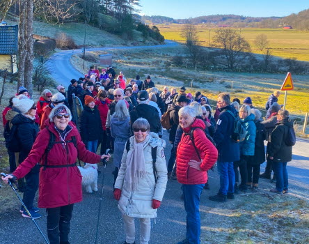 Solen värmde när 76 pigga tjörnveteraner samlades vid Myggenäs gårds parkering. Vi promenerade längs gamla Myggenäsvägen, Mällby, Ävja fram mot väg 160. Där vek vi av upp mot Myggenäs bostadsområde. Fikapausen passade vi på att ta i solen innan vi tog oss vidare. Vid gick på gångstigen förbi skolan och fram till Bränneberget och såg Sjötången. Enligt protokoll hölls där häxerirättegångar på berget där sju häxor och en trollkarl halshöggs och brändes under senare del av 1600-talet. Härifrån såg vi den vackra utsikten över Hakefjorden och holmarna utanför.