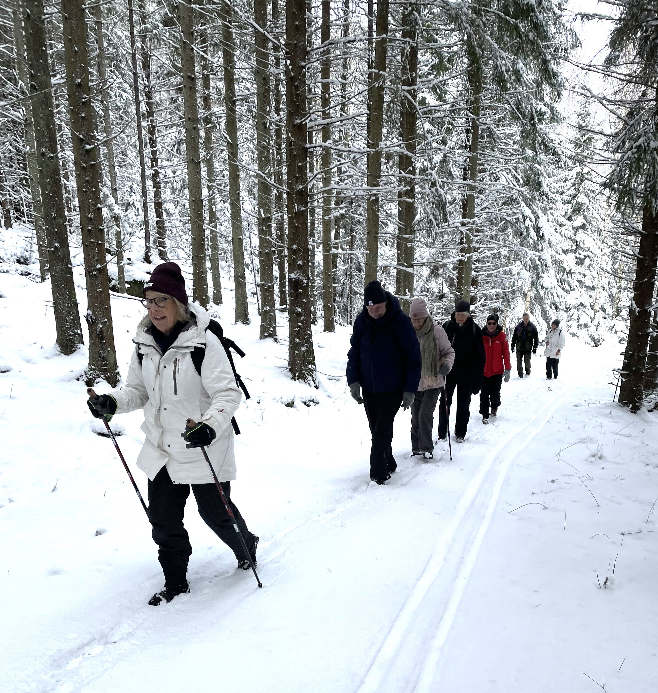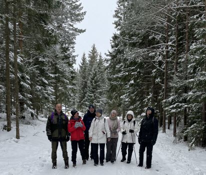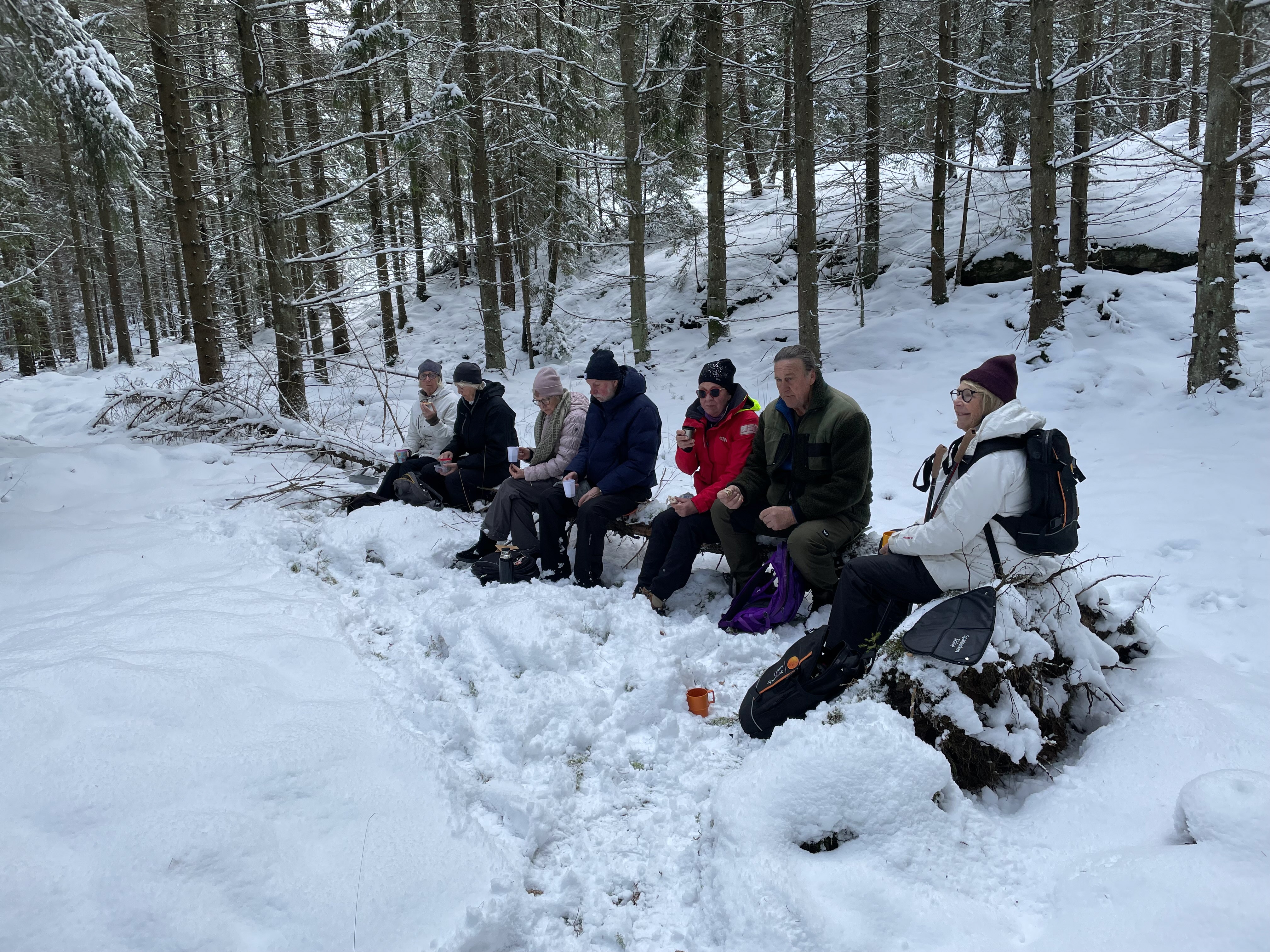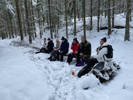 Idag hade vi vår vandring på Stora Askerön. Vi var 8 tappra tjörnveteraner som trampade runt i snön. Promenaden utgick från bron och vidare upp och förbi kyrkogården och ner till Buvik. Där tog vi av till höger och följde skogsvägar och stigar ner till Heden. Tog oss sedan upp till en liten damm och fortsatte därefter tillbaka till våra bilar. Vår fika tog vi i skogen och då passade solen på att visa sig. När vi åkte tillbaka hem började det att snöa ymnigt.