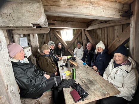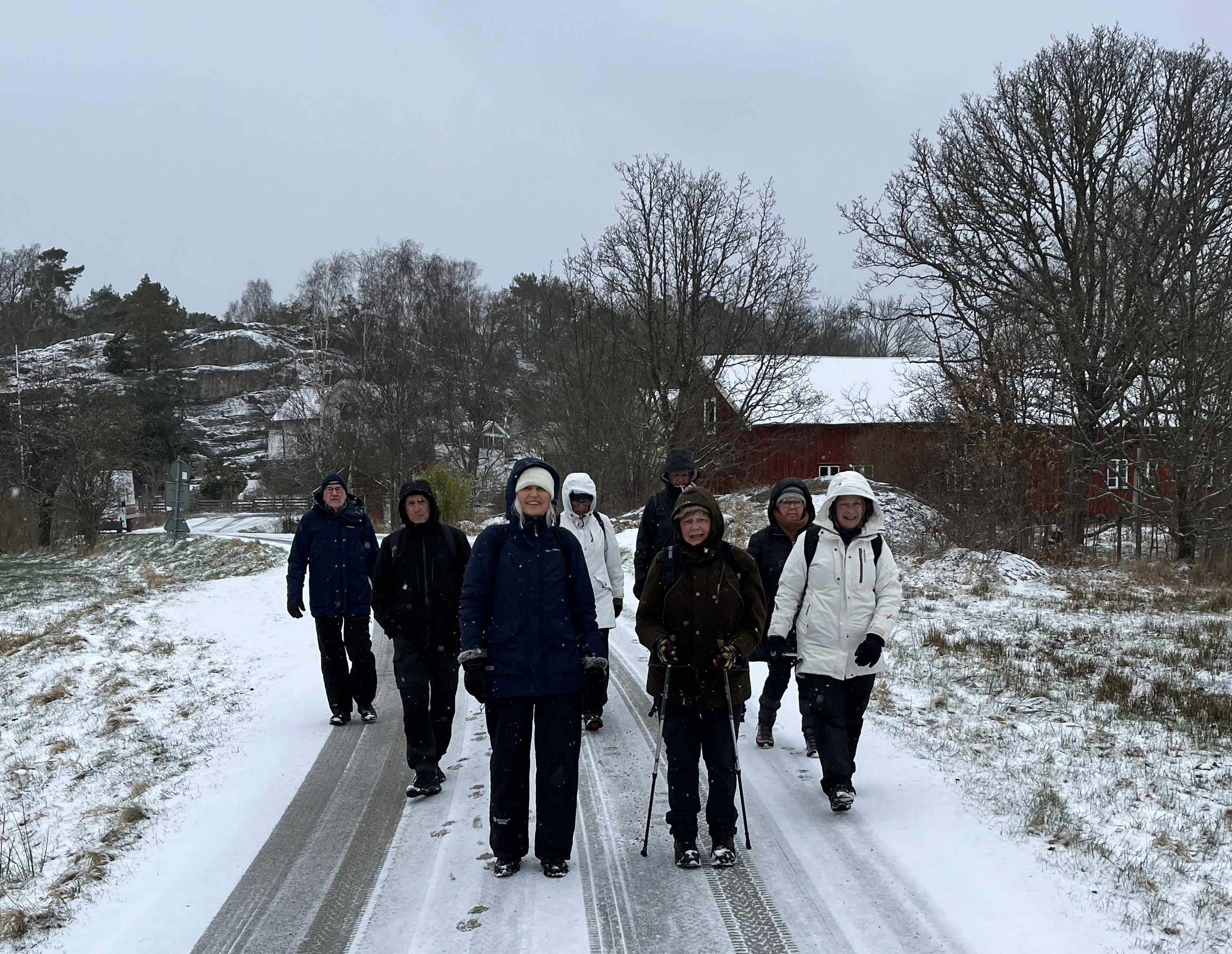 Vart tog våren vägen?? Till dagens vandring på Lilla Askerön kom 9 stycken tappra Spf-seniorer. Vi trotsade snön och kämpade upp och nerför backarna. Under vandringen passerade vi den lilla kyrkogården, klockstapeln och skolan på vägen ner mot kvarnen. Där sökte vi skydd en stund, samtidigt som fikan intogs. Sedan gick vandringar vidare ner till de två lindarna som enligt sägen planterades till minnet av Knaben och Knabas öde. Därefter fortsatte vi tillbaka till bilarna. Vandringen blev ca 5 km.