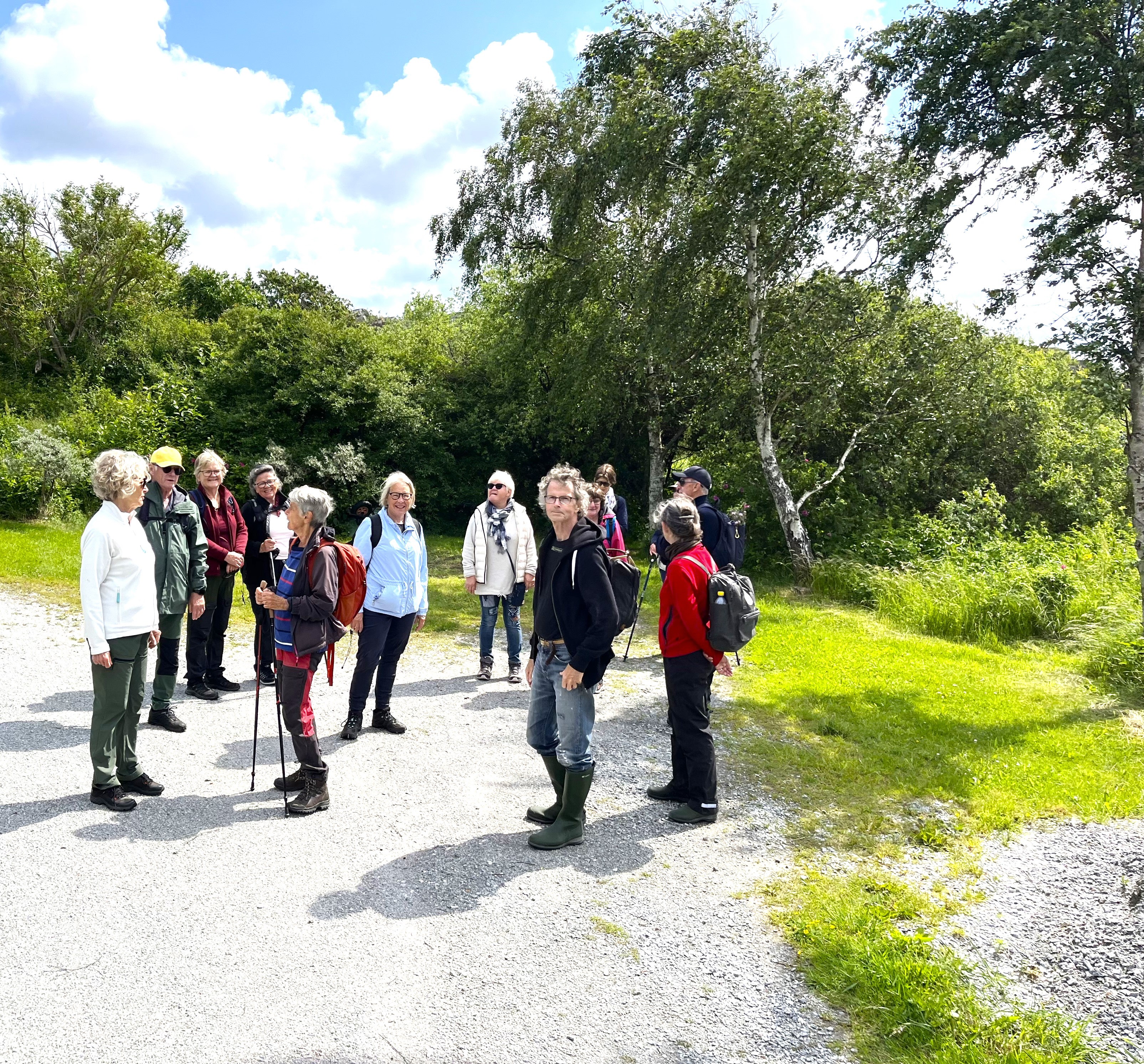 På Sveriges nationaldag samlades 14 Tjörnseniorer på Linnevikens parkering. Därifrån gick vi fram till stora vägen och följde sedan strandkanten till Limhall. Tog sedan den gamla färdvägen ( Kubberslid ) upp till Skogsborg. Fortsatte på stigar och vägar fram till Långekärr. Där gick vi över landsvägen upp till Gullfjäll och passerade bostadsområdet och fortsatte ner till Sunna. Naturen är så prunkande just nu. Överallt kan man se vackra blommor och gröna träd. Under vandringen berättade Henry om gamla byggnader och vissa naturområden. Från Sunna tog vi oss över bergen ner mot Linneviken igen. Sträckan blev ca 7 km.