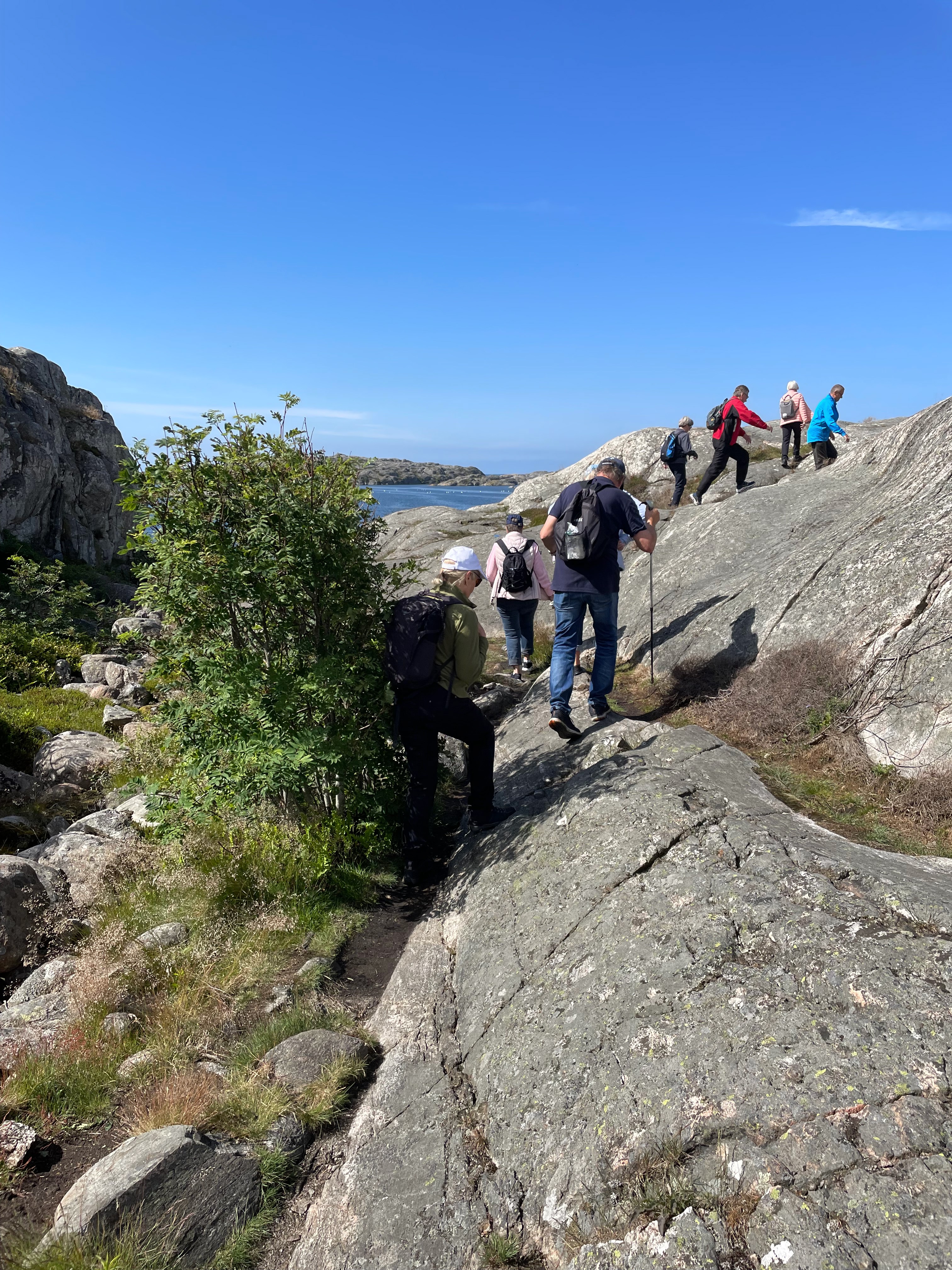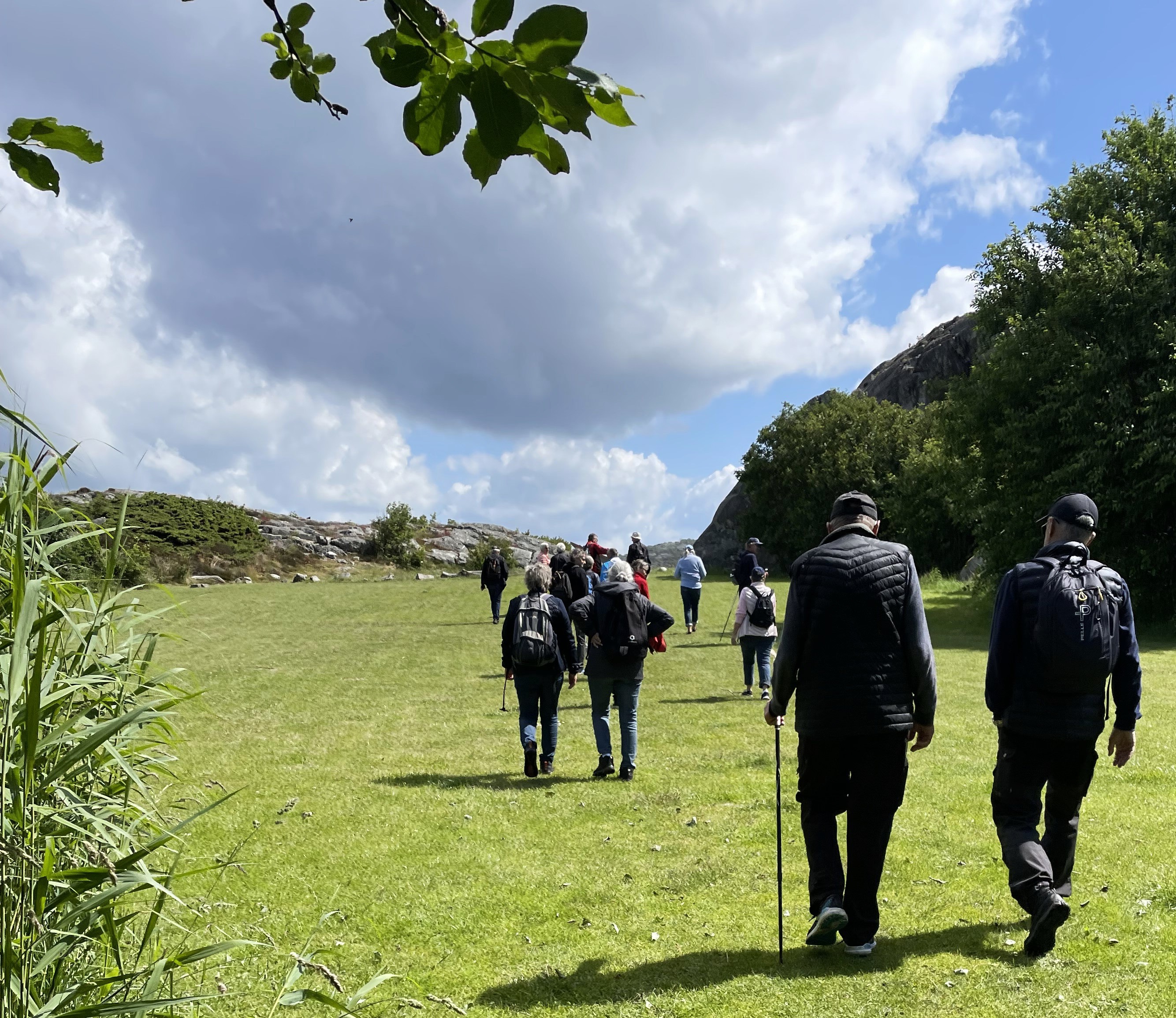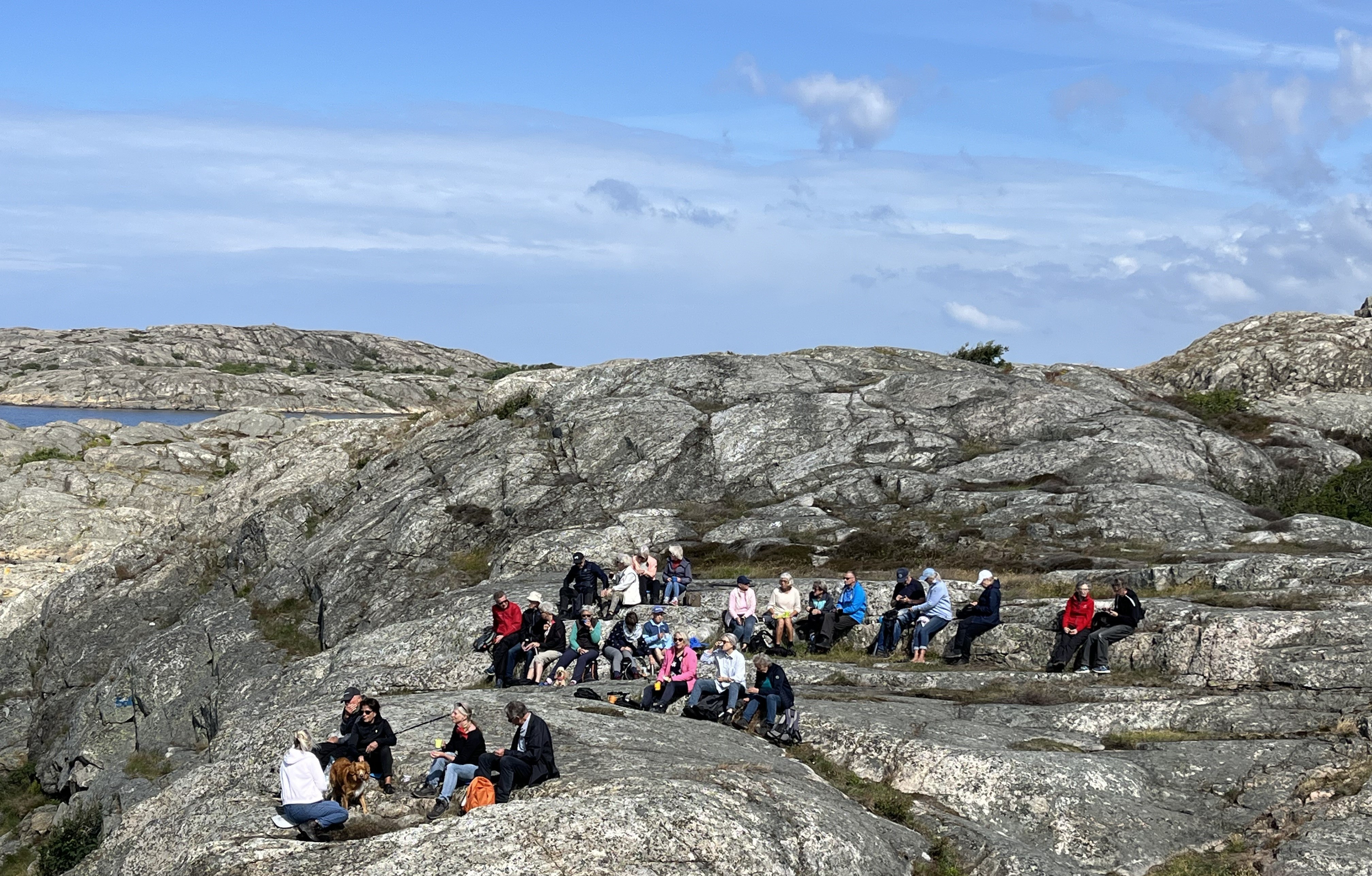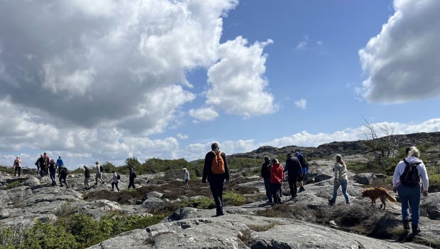 Vårens sista vandring startade på Röavallens grusplan. Efter flera dagars ostadigt väder med regn och blåst blev det äntligen sol och svaga vindar. Vi var 29 stycken Tjörnseniorer som tog vägen fram till Hav och Logi och fortsatte vandringsstigen ut till havet. Där blev det en välbehövlig rast och fikastund. Vi blickade ut över havet och alla småholmarna. Birgitta Söderström berättade om Flatholmen och dess historia. Vi satt där en ganska lång stund och beundrade utsikten. Därefter så tog vi oss tillbaka till bilarna.