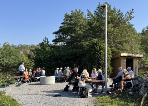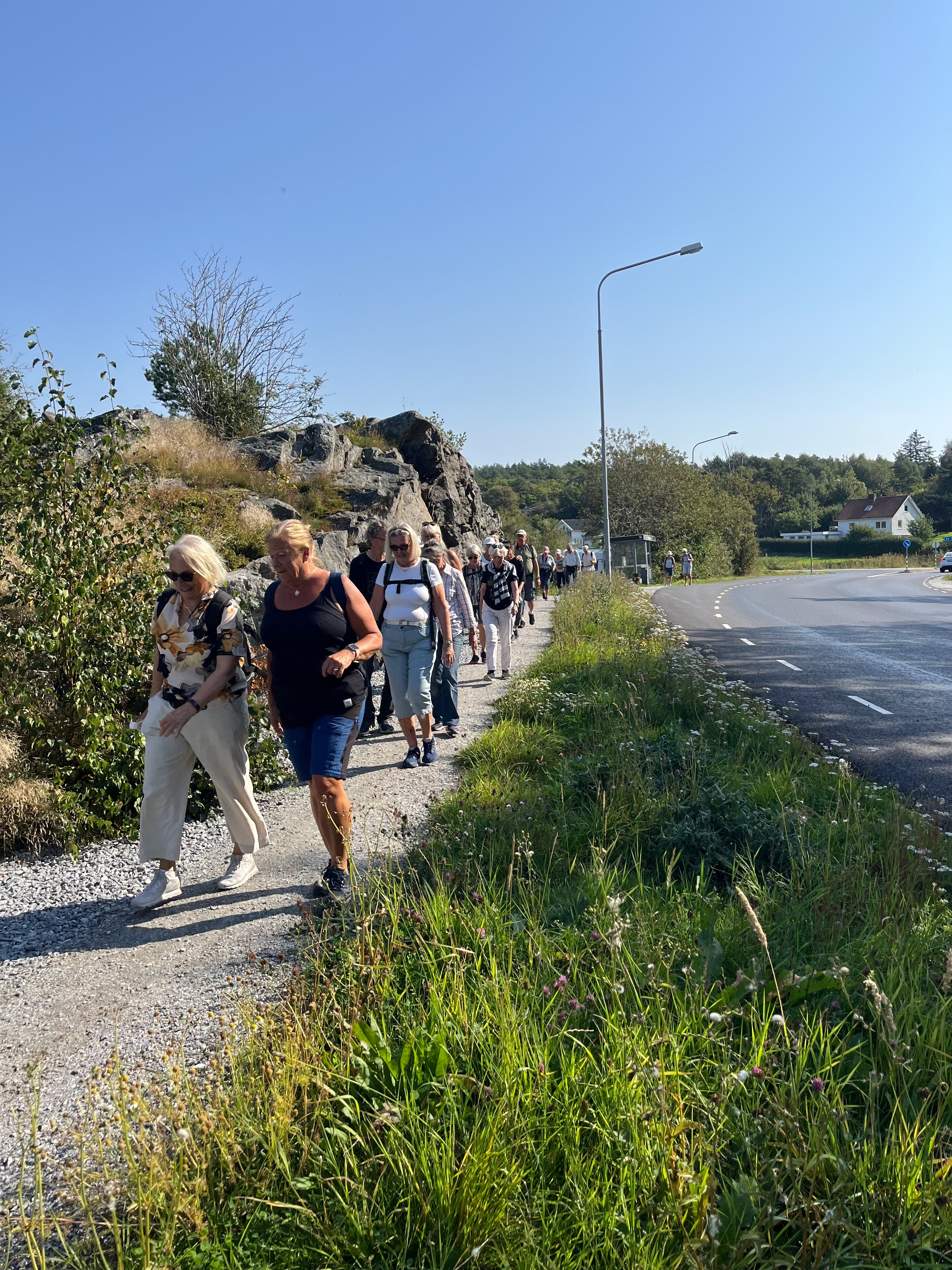 September! Ändå är det sommarvärme! Tillsammans vandrade 21 pigga SPF-seniorer från Boabs parkering Tubbegatan upp till skolan och vidare till Kroksdalsvägen och fram till Skärhamns nya motionsspår. Gick spåret fram till grillplatsen där vi tog fikapaus och lite vila fortsatte sedan