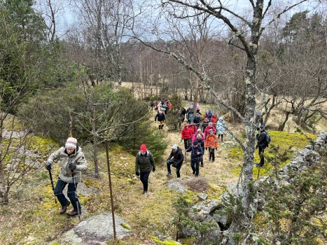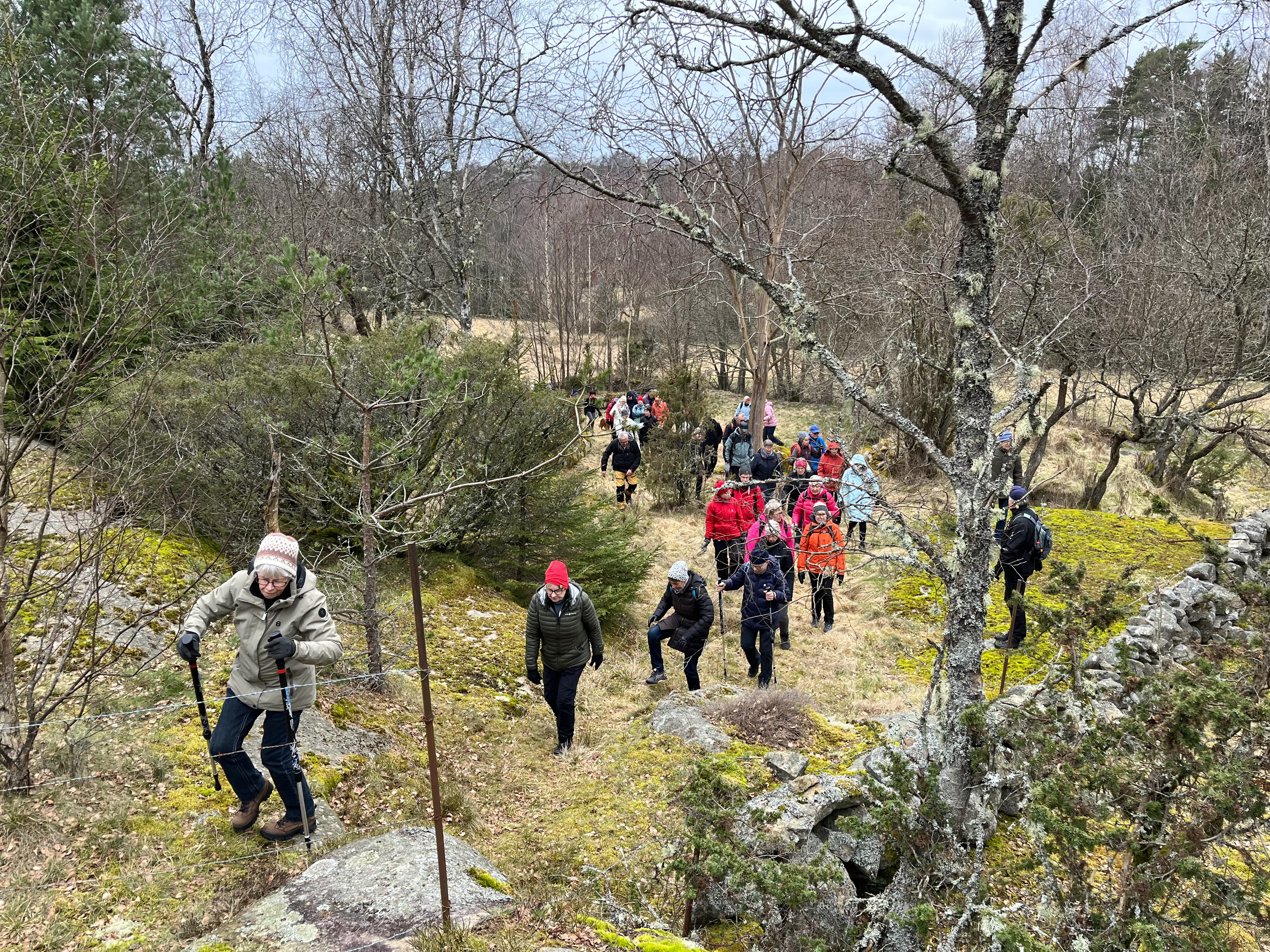 Till Tjörns golfklubbs parkering kom 50 stycken SPF:are idag (28 mars). Denna Skärtorsdag bjöd på grått väder med risk för regn. Promenaden gick mot Valberget och vi svängde sedan av ner till Tyftedamm. Vi passerade flera gamla husgrunder under vandringen. När vi kom ner till dammen välkomnades vi av tranor som flög upp och flaxade iväg. Kanske var det vi som skrämde dem? Vi traskade på och kom till en skogsdunge där vi slog oss ner för rast/fika. Fortsatte sedan tillbaka över bäckar, gärdesgårdar och omkullblåsta träd. Man fick vara observant och se sig för var man satte ner fötterna. När vi kom tillbaka till Golfklubben passade några på att äta en god lunch. Dagens vandring blev ca 6 km. GLAD PÅSK!
