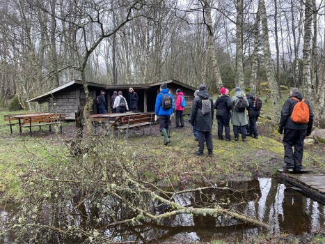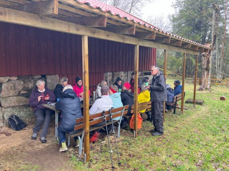 Från Daniel Magnussons gård i Tolleby startade idag 20 SPF-seniorer. Det duggade lite lätt när vi startade men det försvann under tiden vi vandrade. Vi tog vägen mot Vattenverket, stannade till vid skylten Uppegården, läste texten och sedan gick vi sakta uppför backarna. Gick sedan vandringsleden fram till Torpet, där vi fikade. Därefter tog vi en sväng till vindskyddet och där såg vi oss omkring på den vackra platsen. Promenaden fortsatte sedan fram till bilvägen och ner till Tolleby. Idag var det inte så lätt att gå i markerna. Vi fick se oss för hela tiden för det var mycket vått och kladdigt. Denna kulturhistoriska vandring blev cirka 6km.