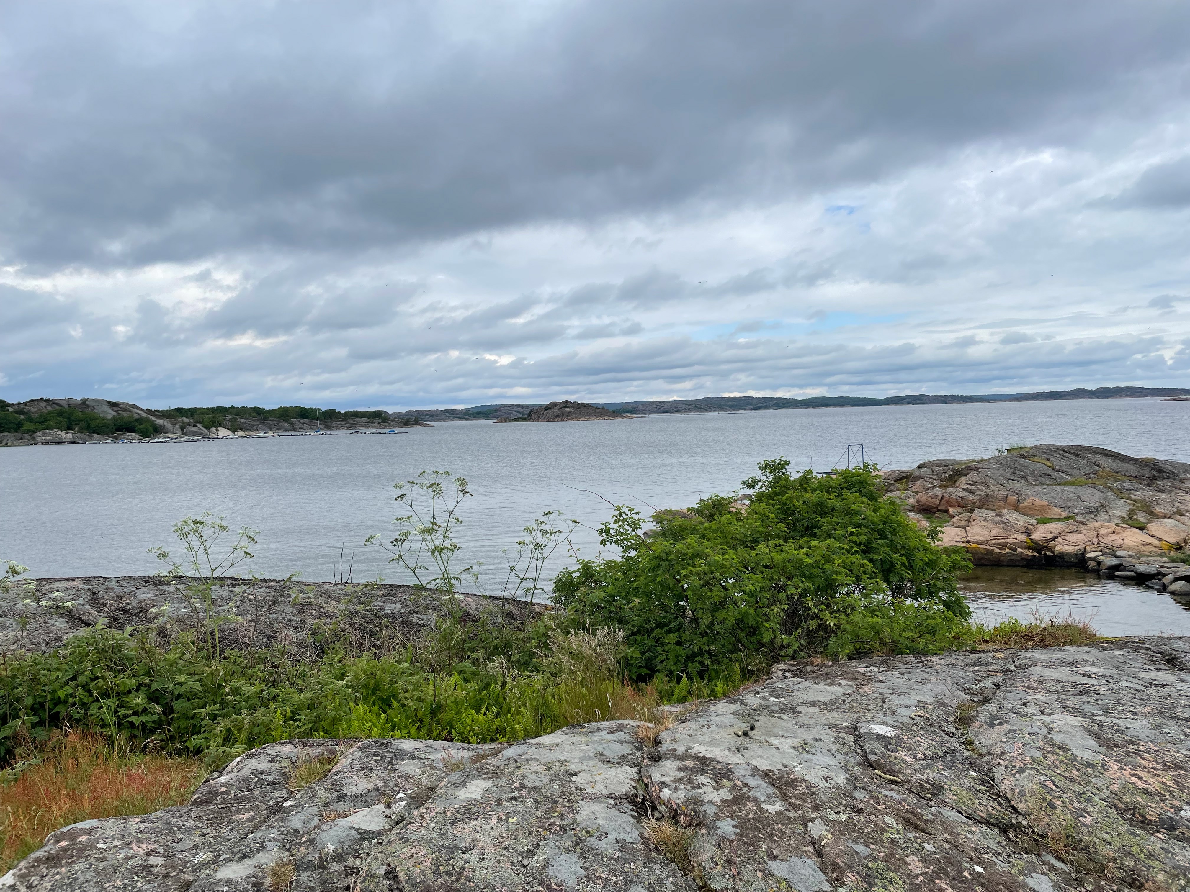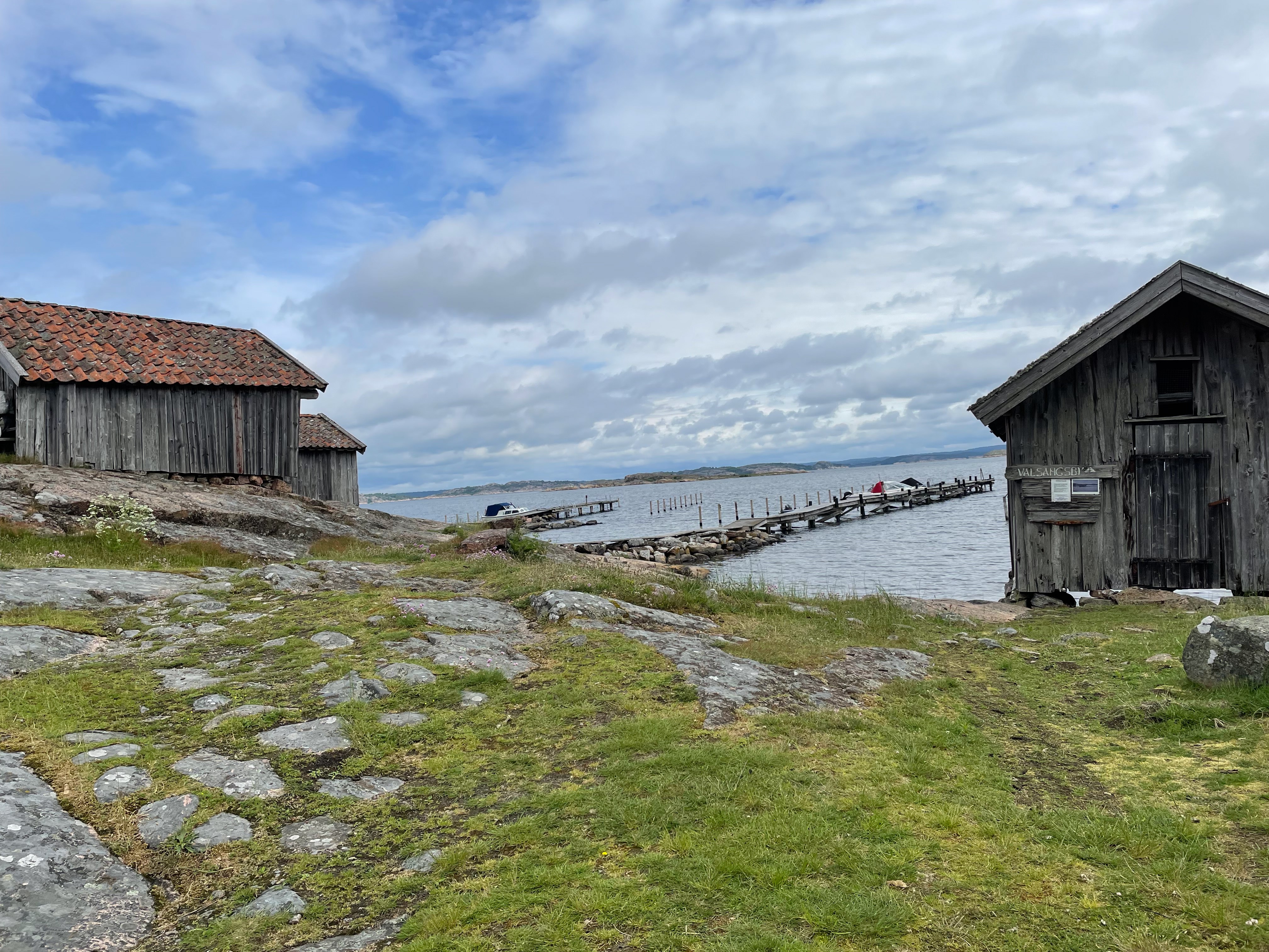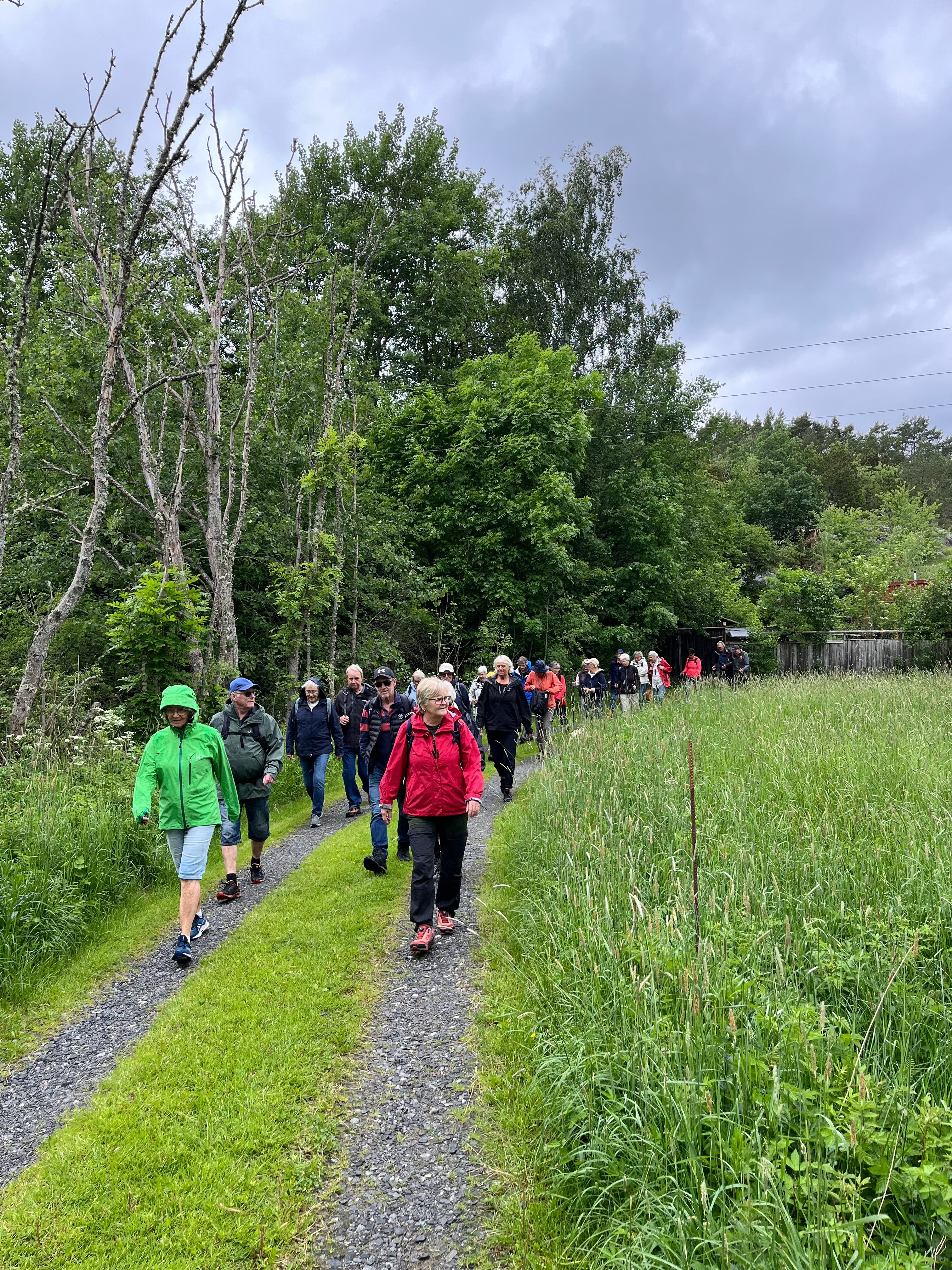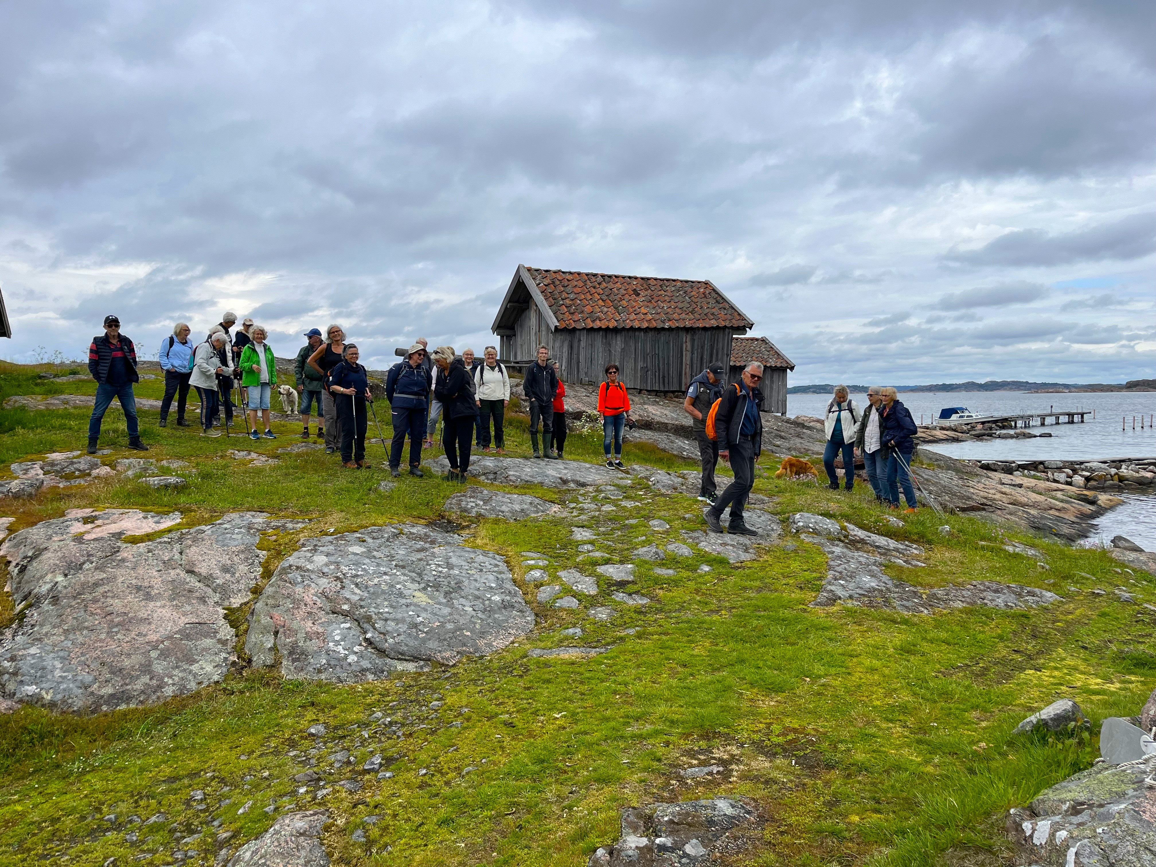Från SMU-lokalen i Valsäng startade 25 Tjörnseniorer dagens vandring. Vi gick ner till de gamla K-märkta sjöbodarna vid Valsängs strand. De är från 1700-talet och var från början fler till antalet ( nu 5 stycken). Efter fikat vände vi tillbaka en bit, svängde av mot Kyrkofjäll och gick fram till Torödsvägen och följde den tillbaka till bilarna. Vilken underbar frodig grönska det är nu, värme, sol och regn gör gott för växtligheten! Idag gick vi ca 4,5 km.