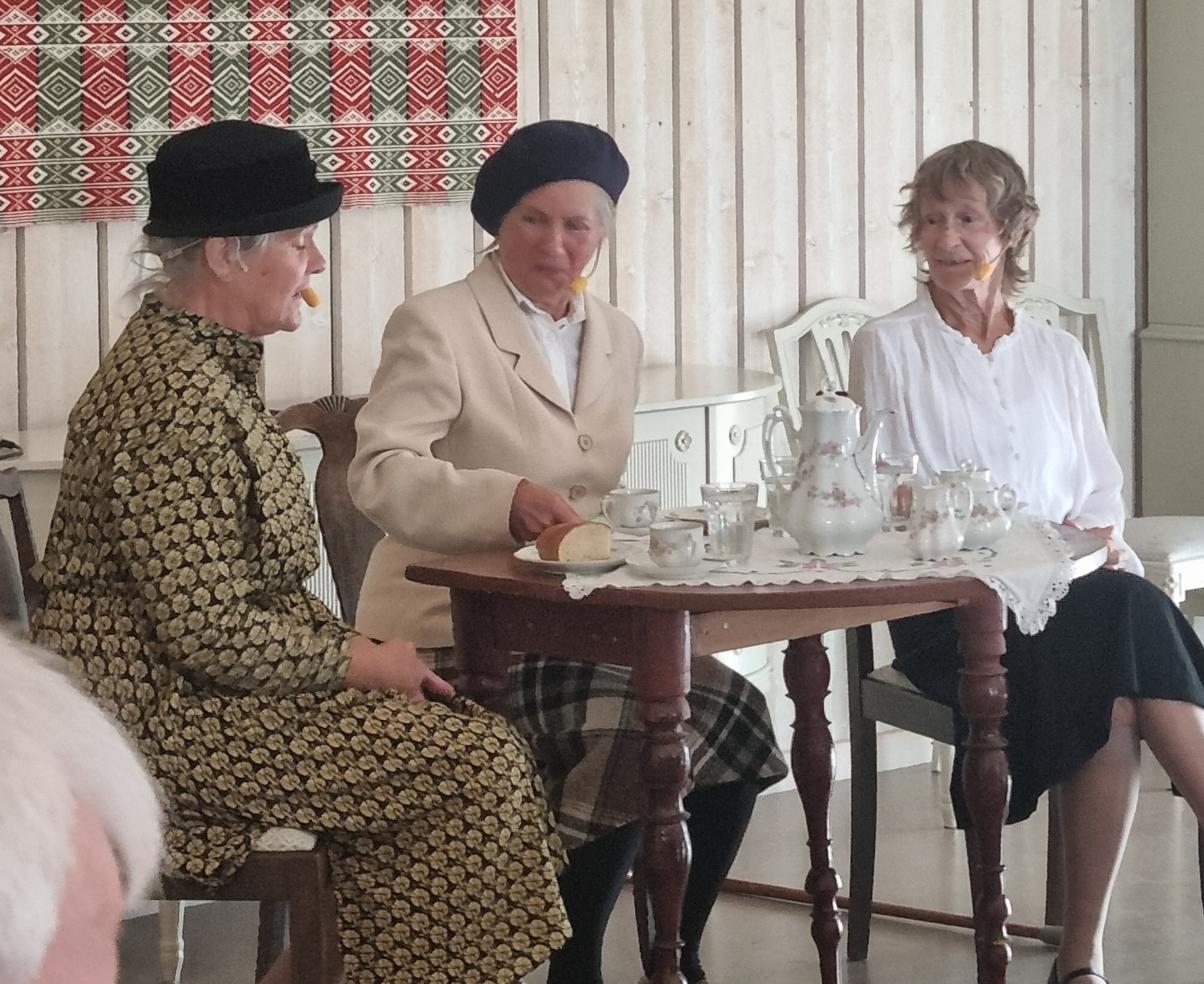 Eva Annerås som Elin Sundberg (1880–1965) från Villa Solfrid i Sunna kom och berättade om sitt liv och vänföreningen. Lite senare kom även två av Tjörns första barnmorskor, Elemina Hansson och Kerstin Gerle och hälsade på. De fick sig en kopp kaffe och en frågestund tillsammans med Elin. En givande föreläsning med ett stycke teater gav oss en hel del av Tjörns kvinnohistoria.