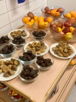 Vi bjöds på glögg och pepparkakor, kaffe/te med lussekatter, frukt, dadlar och fikon och glass.