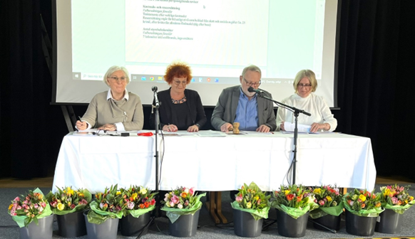 Stämman leddes av Elving Andersson, ordf. Ann-Christine Baar, v ordf, Cecilia Wingren, sekr. (längst till vänster) och Ingalill Johansson, v sekr. (längst till höger).