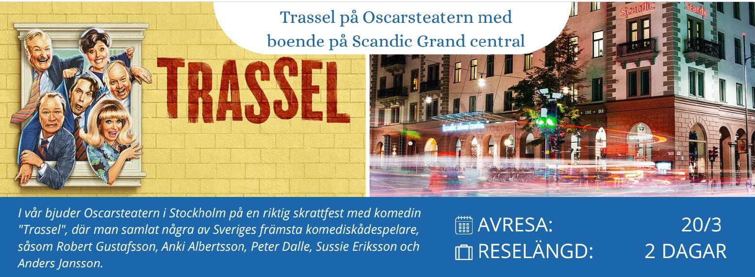 Vid vår vistelse i Stockholm så bor vi på Scandic Grand central som ligger alldeles intill Oscarsteatern. Vi kommer till Stockholm i god tid för att hinna med lite shopping och kanske äta en god middag innan föreställningen börjar. Kl 19.30 börjar Trassel på Oscarsteatern, föreställningen är ca 2,5 timme lång inkl paus. En förbjuden kärleksaffär mellan justitieministern Ragnar Rundqvist och den förvirrade partisekreteraren Lena Stjernström avbryts abrupt när de i förskräckelse hittar ett lik på hotellrummet! I rädsla för att avslöja sitt skandalösa snedsprång ber de Ragnars välvillige assistent Göran om hjälp. Det här blir startskottet för en komedikarusell som snurrar snabbare och snabbare där Ragnar, Lena och Göran desperat försöker gömma liket och samtidigt avvärja en påstridig hotelldirektör, en girig kypare, en envis städerska, en kärlekstörstande sjuksköterska plus en svartsjuk make och en sviken maka. Den prisbelönta komediförfattaren Ray Cooney återbesöker hotellrummet från sin klassiska fars "Hotelliggaren" och skapar ett ännu mer perfekt upplägg för en skrattfylld publiksuccé i högt tempo full av komiska karaktärer, invecklade förvecklingar och rafflande upplösningar. Det blir en trasslig skrattfest som gjorde kritiker- och publiksuccé i Kalmar 2019, när nu våra roligaste skådespelare möts på Oscarsteaterns scen i Stockholm. |