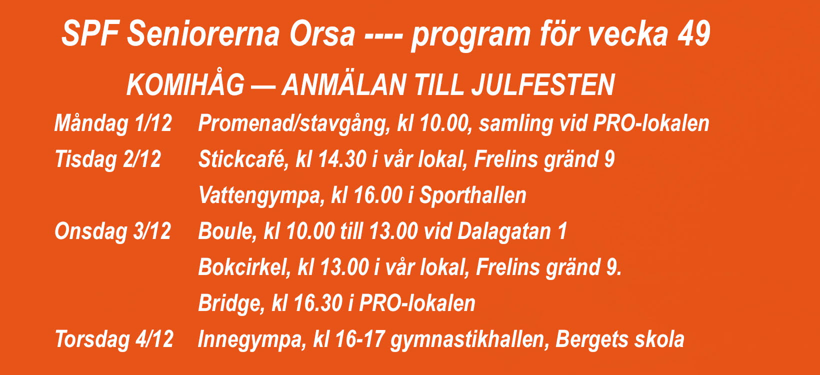 SPF Seniorerna Orsa program för vecka 49