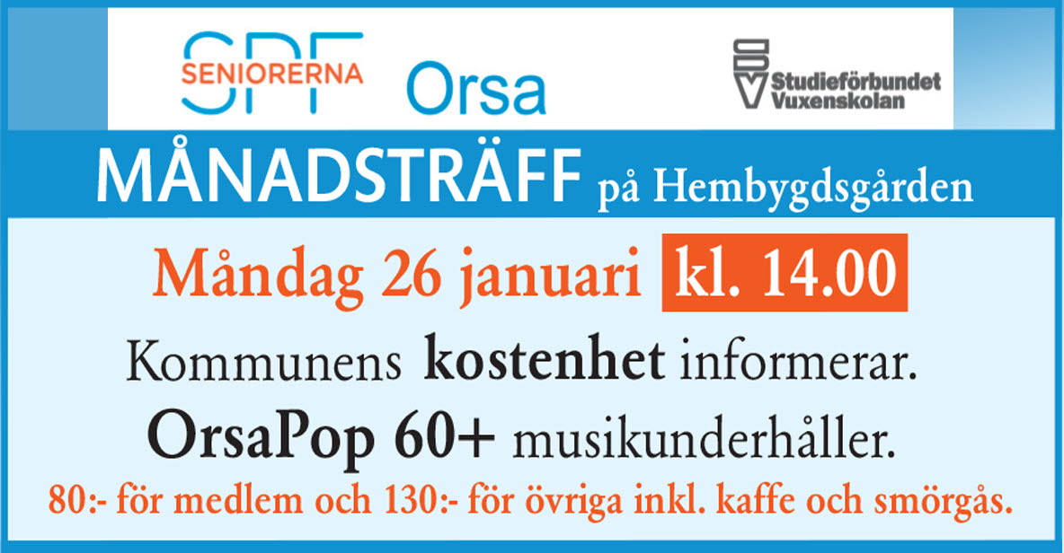 Kostenheten från Orsa kommun informerar. --- OrsaPop 60+ musikunderhåller.