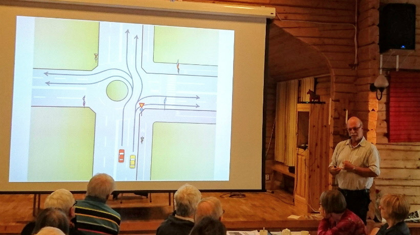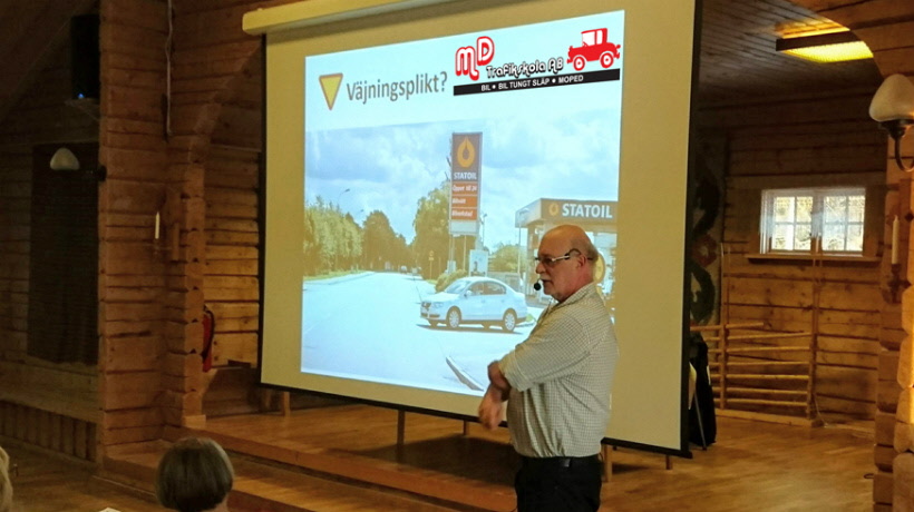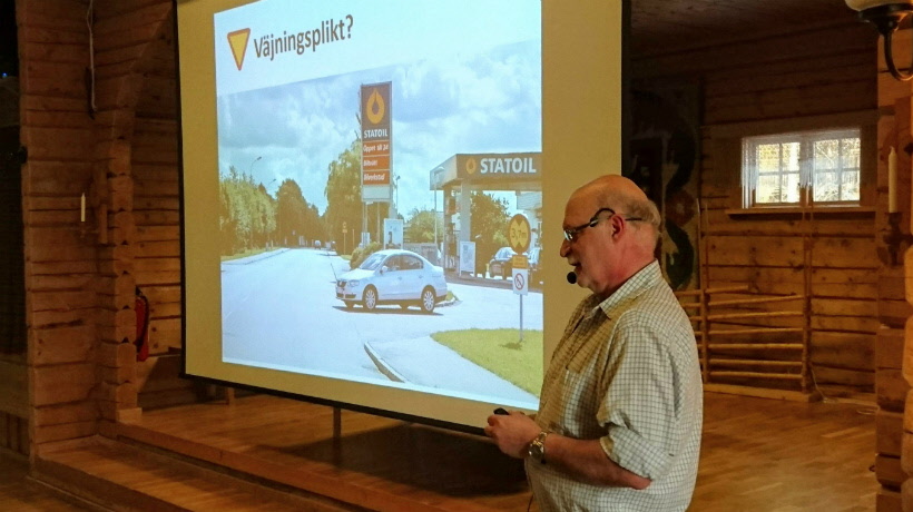 Han gick igenom olika vägmärken vad gäller parkering och gångfartsområde (max 7km/h), hur vi bäst kör i rondeller och framförallt högerregeln som många har svårt för. Han nämnde också om nya besiktningsregler.
