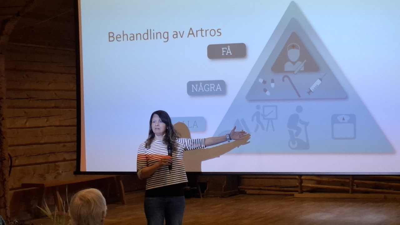Ämnet för dagen var artros. Det är en sjukdom som dessvärre är mycket vanlig bland oss pensionärer. Dr. Mannerroos förklarade vad artros är och hur den kan behandlas. Till stor hjälp var fysioterapeut Annika. Hon visade oss olika övningar och rörelser som underlättar vid artros. Hon betonade särskilt hur viktigt det är att stärka sina muskler och då främst benmusklerna. Starka benmuskler avlastar både knän och höfter.