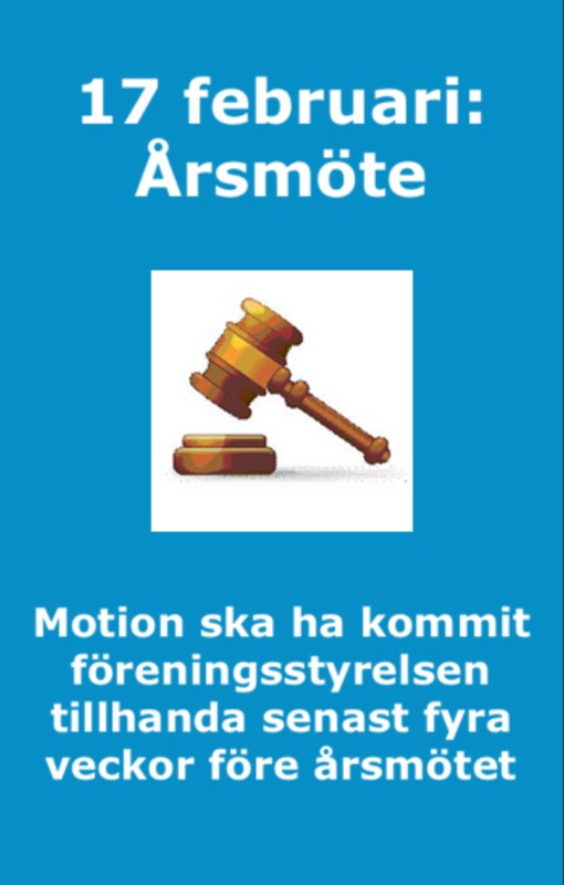 Motion till ordinarie årsmöte kan väckas av medlem. Motion ska ha kommit föreningsstyrelsen tillhanda senast fyra veckor före årsmötet. Klicka på Läs mer för att komma till sidan där årsmöteshandlingarna redovisas (när de finns tillgängliga).