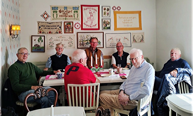 Klicka på Läs mer för en bild på en av KGK-grupperna runt fikabordet på sitt stamställe, Gjuthuset. Från vänster Erland Jacobson, Alf Andersson, Per Börjesson (med ryggen åt) Arne Andersson, Henning Strand, Tore Willdal och Bengt Djärv. – Vi har alltid mycket trevligt på våra möten, och samtalar om allt mellan himmel och jord, berättar Arne Andersson.