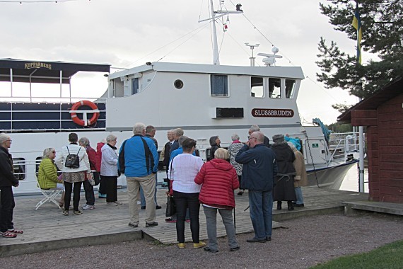 Prick kl 12.00 lade m/s Slussbruden ut från kajen vid slussen för att under två timmar servera oss lunch och erbjuda en guidad visning av Runn. Vi som åkte med var 30 SPF:are.