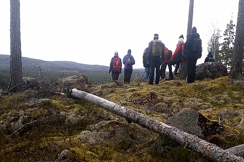 På hemvägen tillbaka till Vällgården tog vi en omväg upp på Stugutjärnsberget till ett nytt hygge med en fantastisk utsikt.Här beundras den av några av deltagarna: