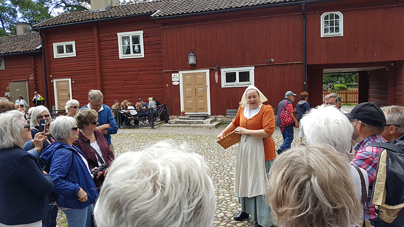 På återvägen släppte kapten av oss i Wadköping. Där mötte oss en mycket kunnig och påläst guide som berättade både om byggnaderna och de människor som har bott och verkat där. Vid några tillfällen stötte vi på Kajsa Varg, som livfullt beskrev hur livet kunde gestalta sig för en husmamsell på 1700-talet. Intressant, men jag tror inte att någon skulle vilja leva som dom gjorde då.