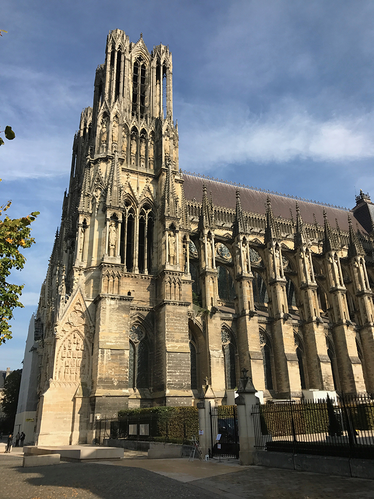 Katedralen Notre-Dame de Reims är en imponerad kyrka i gotisk stil och känd för en riklig utsmyckning med statyer. Katedralen var en kröningskyrka där 33 kungar har krönts, den sista 1825 Kyrkan är världsarv sedan 1991. Jeanne D'Arc står också staty i kyrkan.