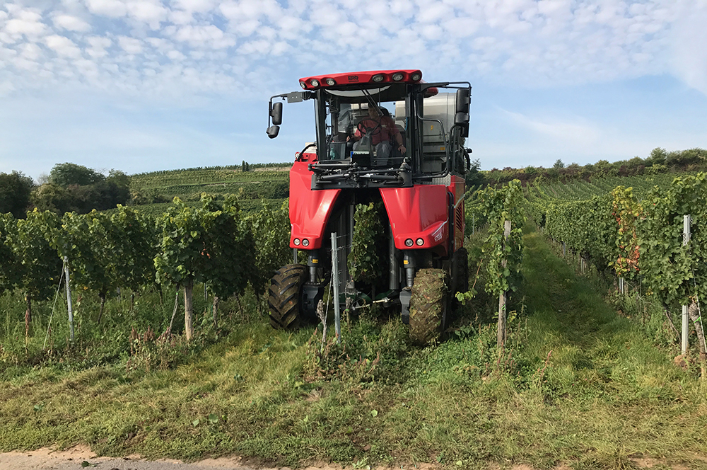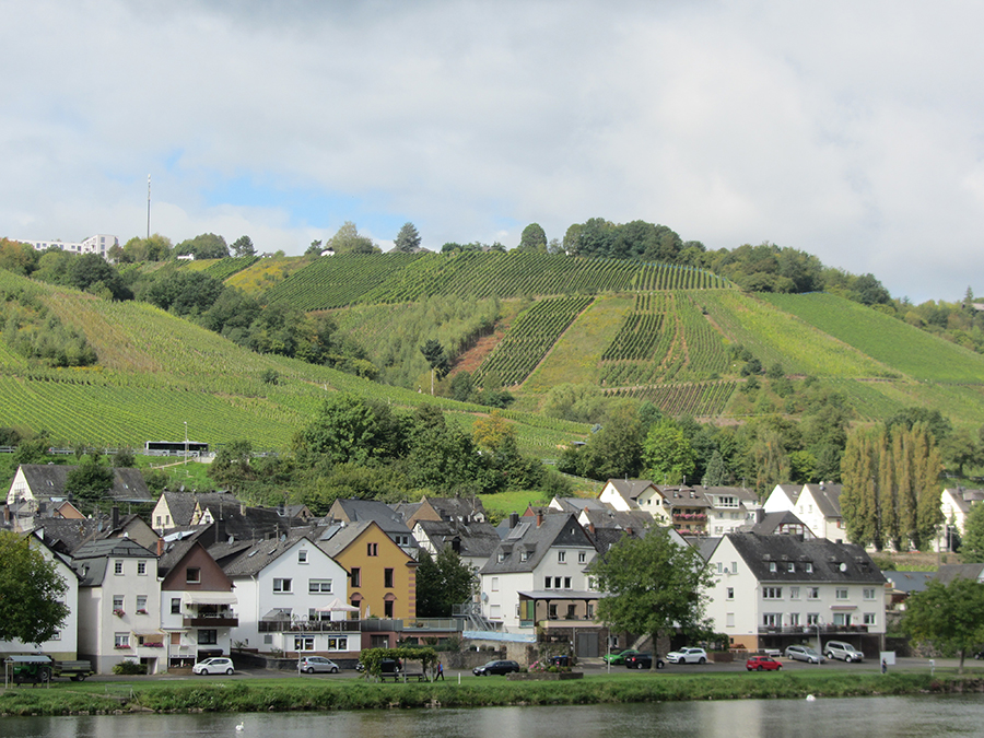Vi åkte längs Moseldalen med sina vackra vyer där vinfälten klättrade på bergssluttningar. Här skördade man allt för hand och för att kunna göra det på de branta sluttningarna har man byggt små liftstolar som går på räls för att komma upp. På slättlandet skördar man mest maskinellt.