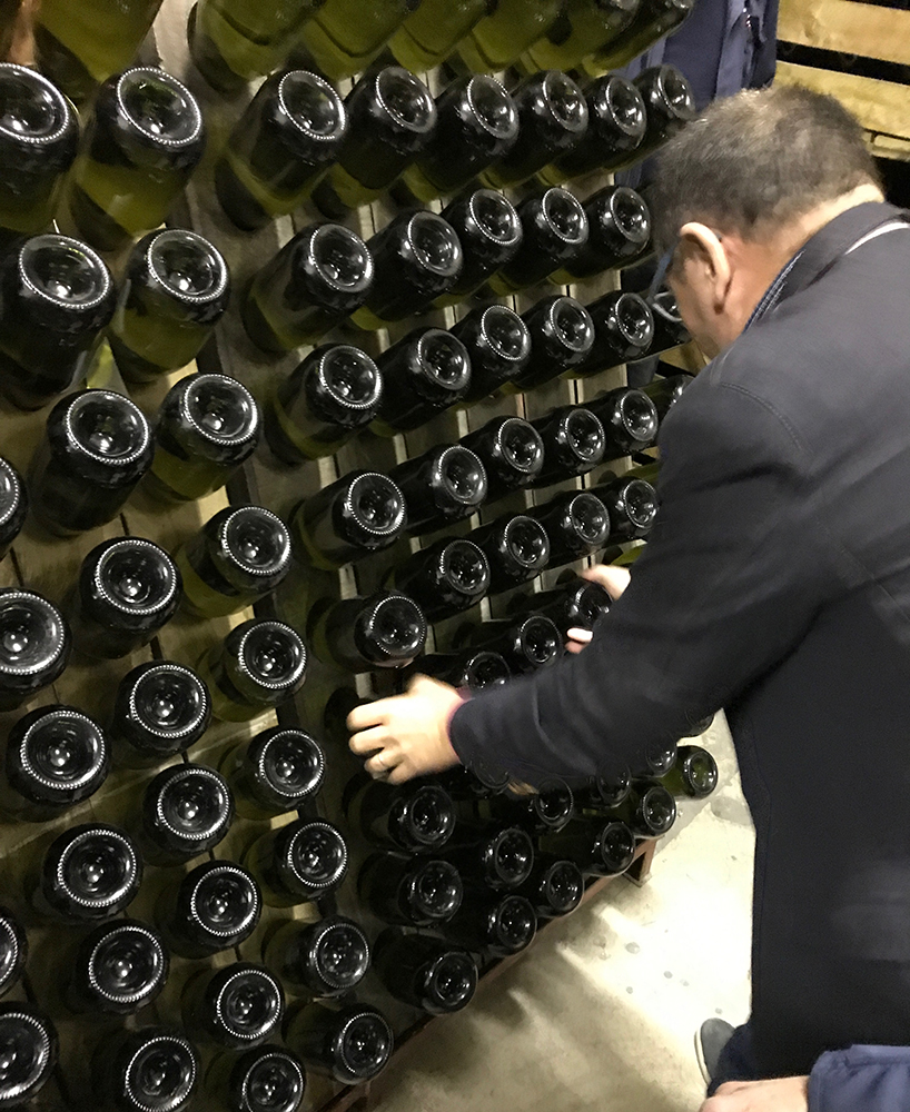 Efter plockningen pressas druvorna och saften tappas i stora ståltankar och första jäsningen börjar. När den är klar är det dags för andra jäsningen då bubblorna bildas genom att man tillsätter socker och tappar på flaskor och sätter på en vanlig kapsyl. Den andra jäsningen tar ett par veckor och nu har det blivit ett mousserande vin. Nu förvaras flaskorna i minst 15 månader i svala källare/kylrum innan de börjar säljas. Vid jäsningen bildades en fällning av döda jästsvampar som ger champagnen dess speciella aromer och karaktär. Fällningen måste bort för ingen vill dricka en champagne som inte är klar o fin. Ett par veckor innan den skall avlägsnas ställer man flaskorna i 45 graders vinkel i ett träställ. Varje dag vrider man flaskorna ett kvarts varv för att fällningen skall sjunka mot kapsylen. När det är dags att avlägsna fällningen kyler man ner halsen till -28 grader och fällningen fryser då till is. Sedan ställer man flaskan lodrätt och tar bort kapsylen och genom trycket i flaskan flyger isproppen ur. En del vin går då förlorat och man fyller på nytt plus en sockerblandning och jäsningen börjar på nytt. Hur mycket beror på vilken Champagne man vill ha. Nu sätter man på korken och stålgrimman och flaskorna är klara.