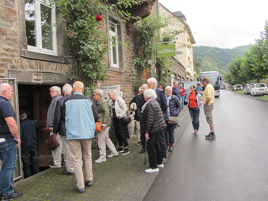 I Zell besökte vi vinbonden "Weingut Hallenbach". Den yngre generation har även här tagit över och sonen vi träffade hade efter avslutade studier kommit hem. Vi provade sju sorters vita vita viner och började med en bubblande sekt.