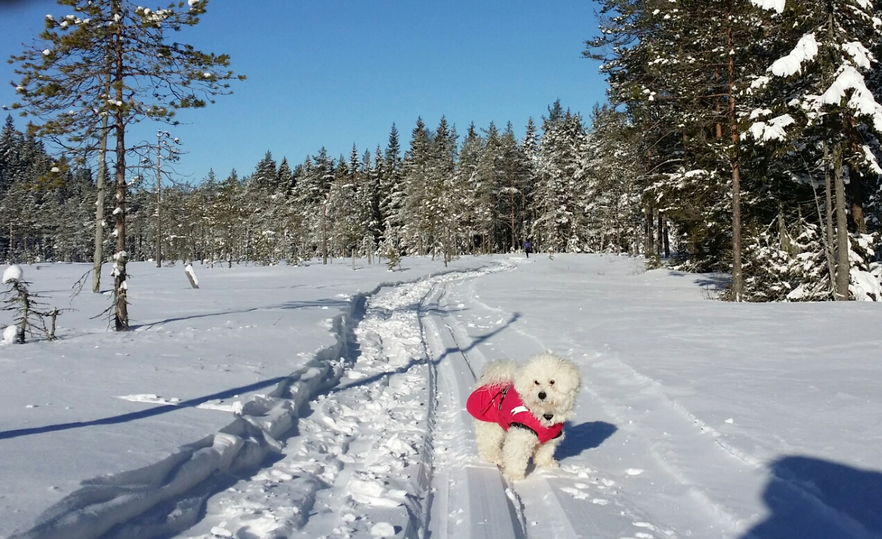 Den var fina nyuppkörda spår - 5an och 7an. Bjursåsskolan hade friluftsdag, så det var massor med barn och vuxna, främst i pulkaspåret. Det var två till hundar också, men dom fick springa själva - ingen ryggsäck där inte.