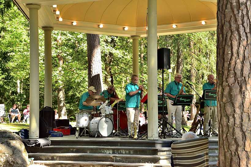 Den här söndagen var det Falu Evergreen som spelade jazz, härlig musik. Även om arrangemanget, som Falu kommun står bakom, är riktat till alla kommuninvånare så var det nog en väldigt stor andel som kunde klassas som seniorer. Till vilka även orkerstern hör, medelåldern för dem var nästan 80 år. Men fortfarande lika pigga och spelglada.