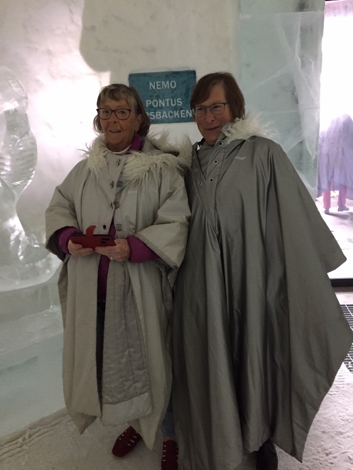 Idag går färden vidare mot Malmberget. En deprimerande syn där vi ser alla tomma villor, hyreshus, butiker mm. Flyttning av byggnaderna pågår för fullt. Vi som var här för ett år sedan, när vi åkte Inlandsbanan, kan konstatera att det hänt en hel del och den stora gropen växer. Vi åker dock vidare till Jukkasjärvi där vår guide väntar vid Ishotellet. Hotellet anläggs varje vinter vid Torne älvs strand och har tidigare funnits endast säsongs-mässigt och har sedan återvänt till älven. Numera erbjuder hotellet en del med ett året runt-öppethållande med hjälp av kylteknik. Vi avslutar besöket med en lunch.