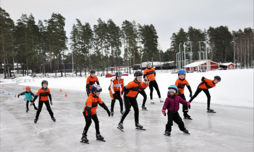 Söndag förmiddag på den spolade friidrottsbanan på Lugnet och full fart under skridskorna för barn och ungdomar – och för Daniels Sven Olsson som leder träningen och som syns i mitten av klungan.