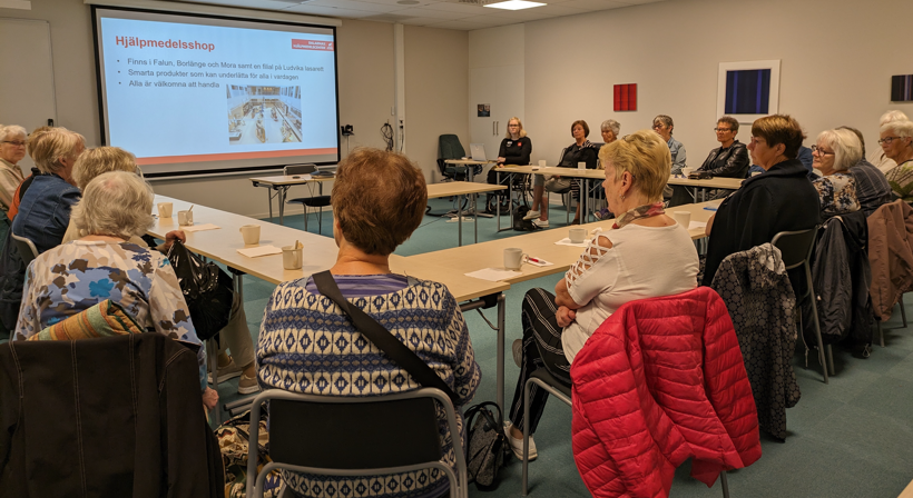 Den 29 augusti samlades ett tjugotal SPF-medlemmar i Dalarnas Hjälpmedelscenter i Borlänge. Birgitta Gradén från SPF Seniorerna Falun hälsade oss välkomna i samband med kaffe. Vi fick därefter lyssna till assistenten Linnea Berglund, som presenterade Region Dalarnas verksamheter inom ramen för Hjälpmedelscentren. De finns idag i Borlänge, Falun, Mora plus en liten filial i Ludvika. Alla hjälpmedel som köps på plats eller förskrivs kommer från ett centralt lager på Ingarvet i Falun och varorna skickas ut till hela regionen.