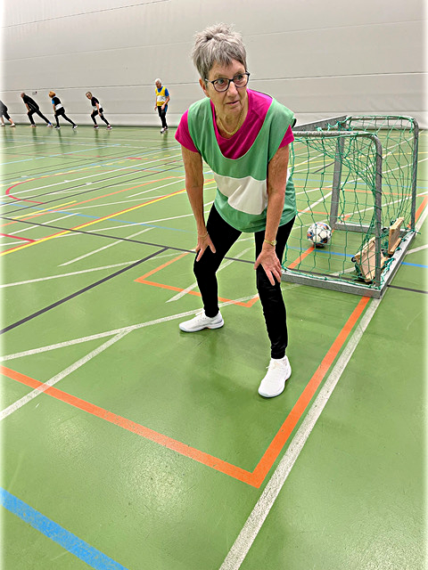 Kerstin Andersson, som är kontaktperson för gåfotbollen, tar emot två nya spelare den här dagen. Hon berättar att som är gammal fotbollsspelare är det svåraste att inte skjuta för långa passningar eftersom medspelarna inte får springa.