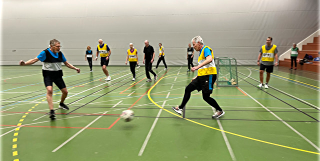 Gåfotbollen är i gång igen efter juluppehållet, och den här tisdagen går 25 män och kvinnor omkring och spelar fotboll i D-hallen på Lugnet. Att de går är just det som gäller i gåfotboll.