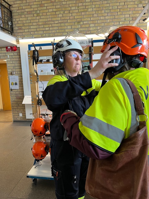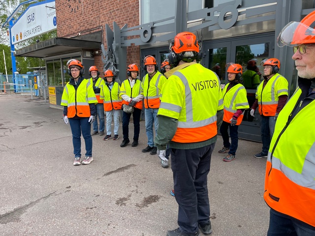 Men först får vi varselvästar, vantar för att skydda oss från smuts och hjälmar med visir och hörlurar, som stänger ute buller, men låter oss höra Lotta Olsson via hennes mikrofon och lastas in i bilar som tar oss till besöksporten i varmvalsverket.