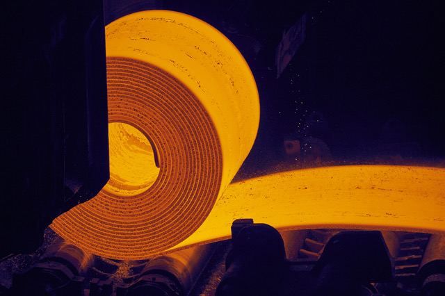 Vi får se stålet valsas i varmvalsverket och slutligen rullas upp stora rullar. Foto: SSAB