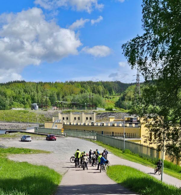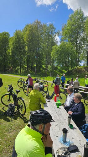 Idag var det lite kyligt, 13 grader och blåsigt vid starten från Stora COOP. Färden fortsatte längs cykelvägen på väg 293 och vi tog av mot Kvarnsveden via Forshuvudbron. Vi passerade KP, numera EcoDataCenter innan vi hittade vägen ner mot Dalälven för att senare stanna till vid vårt fikaställe på ängen nedanför Gammelgården. Där var det varmt och skönt i solen.