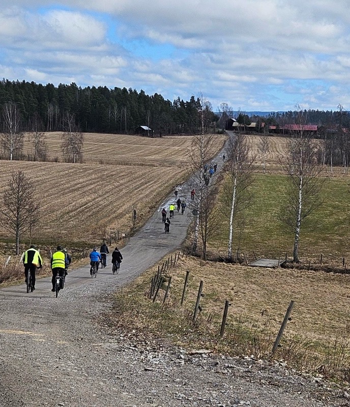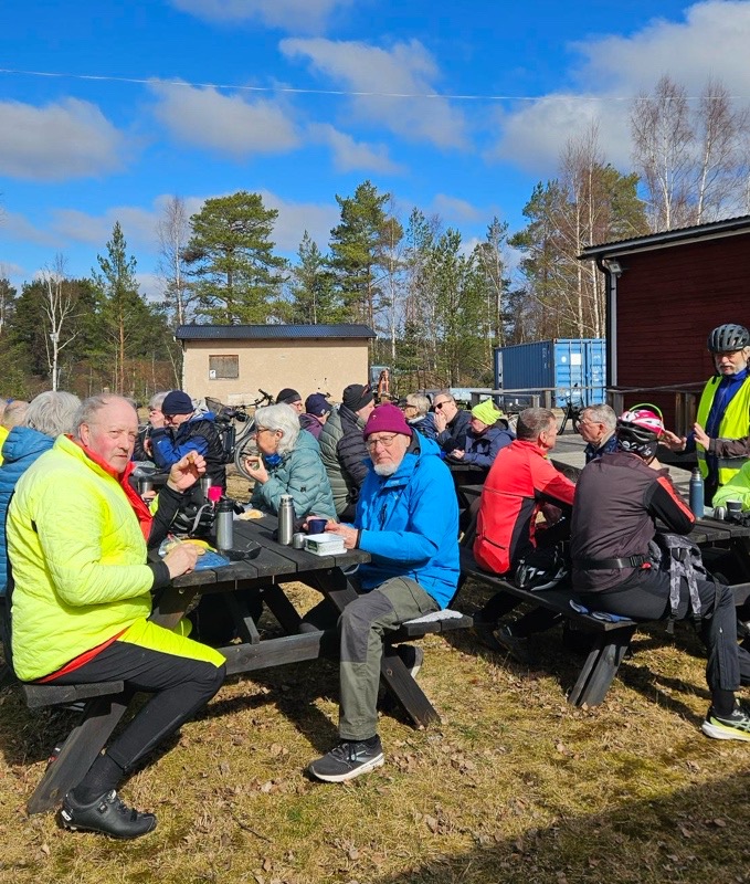 Oj, vilket intresse det var för denna tur! Trodde att det var lite för kyligt för många eftersom nätterna fortfarande är kalla och det tar lite tid innan solen värmer, men ack så fel jag hade. Långkalsonger på och då klarar man kylan! Jag fick hjälp, som så många gånger tidigare, av Lilian att räkna ihop alla deltagare. Hon fick det till 28 personer vid starten vilket är rekord för cykelturerna, som startade 18 juli 2023. Då, på första turen som gick till Ornässtugan, var vi 4 personer. Och det regnade rejält på hemvägen. Nu är vi lite mer noggranna 😀, vi byter helt enkelt cykeldag om det förutspås regn. 🌧