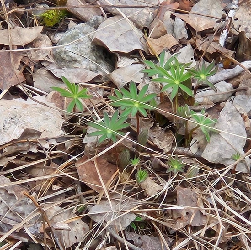 Det har ännu inte blivit mycket till grönt så jag försökte vid ett kort stopp leta efter något som stack upp ur under torra löv och fjolårsgräs. Det jag hittade var nog lupiner som försökte ta plats.