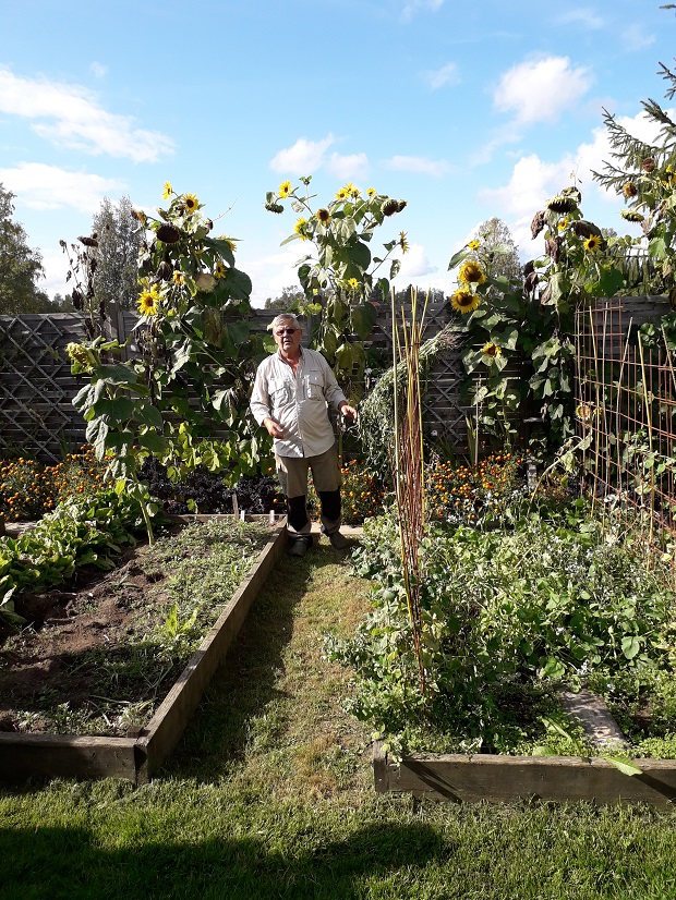 Här har vi Jan vid en del av sin trädgård Observera solrosorna i bakgrunden på det övre kortet. Där fanns spetskål, matpumpa, flera sorters tomater, chili samt mycket annat som egentligen inte skall gå att odla i Malung.