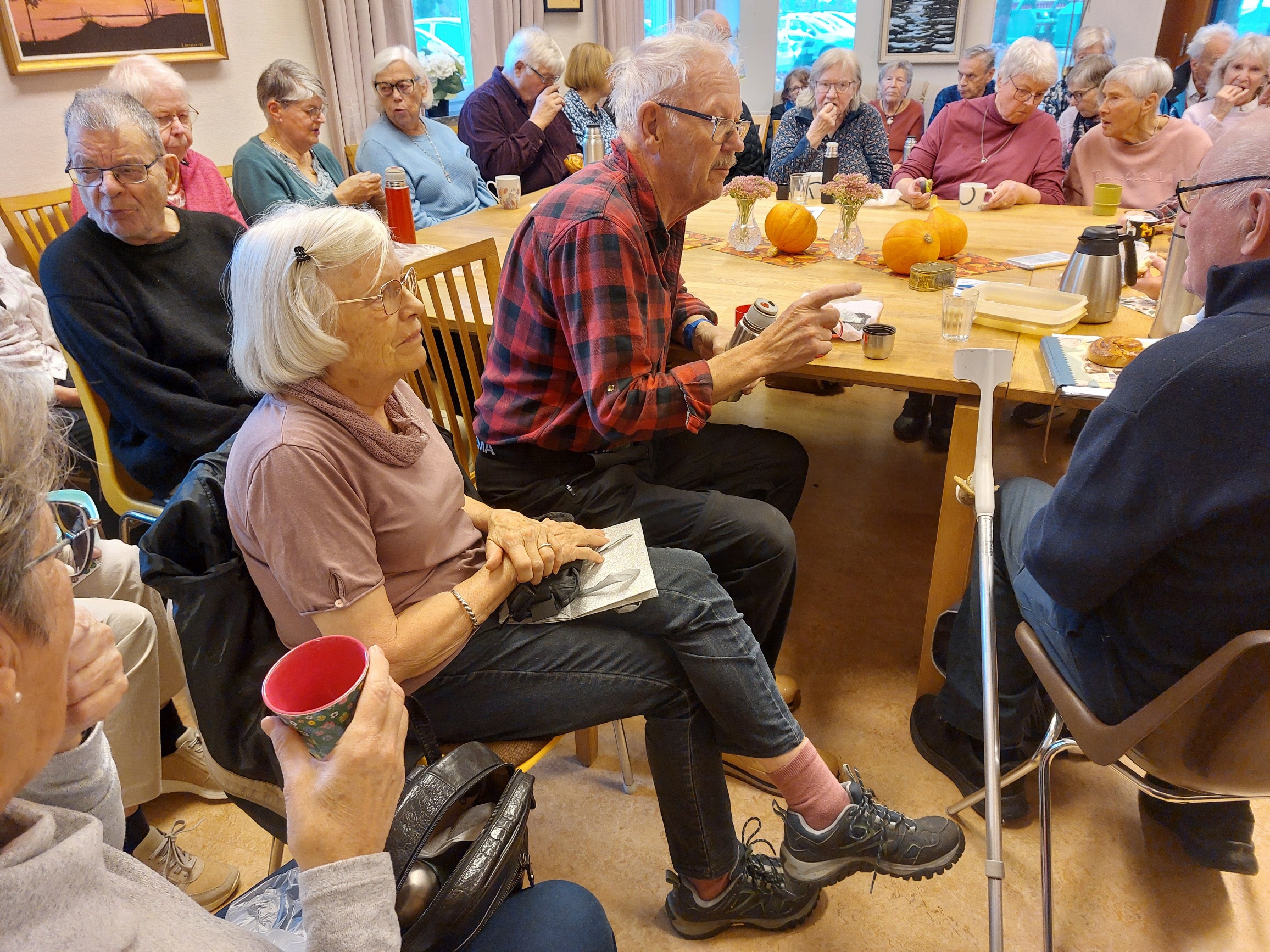 Det kom många till lokalen i Romme när Thure Klintman besökte cafémöte. Alla extra stolar fick bäras in så alla fick sittplats. Det blev en glad tillställning med många skratt när 87 årige Thure berättade om sitt liv från födseln i Snöåbyn i Vansbro. Hans far var mjölnare, hade kor, grisar och höns som alla gårdar i byn. En riktig bondby där mjölkning morgon och kväll satte dagsrytmen. Efter 7 år i skolan sökte Thure jobb och blev svetsare på en verkstad. Nästa jobb blev på järnvägen i Vansbro. Efter över 40 år på SJ slutade Thure som driftschef. För att nå den positionen krävdes gymnasiekompetens som Thure läste in på distans.