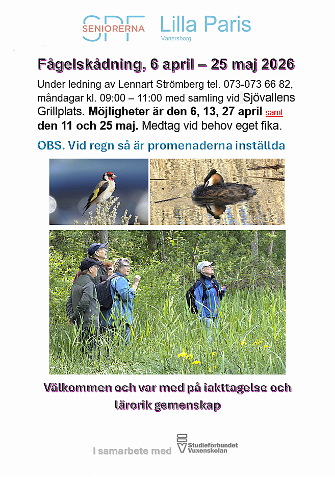 Fågelskådning 09:00-11:00 måndagar 6/4, 13/4, 27/4, 11/5 och 25/5 under ledning av Lennart Strömberg, 073-073 66 82 Samling Sjövallens Grillplats. Vi pausar med medhavd fika. Inställt vid regn. Se info här